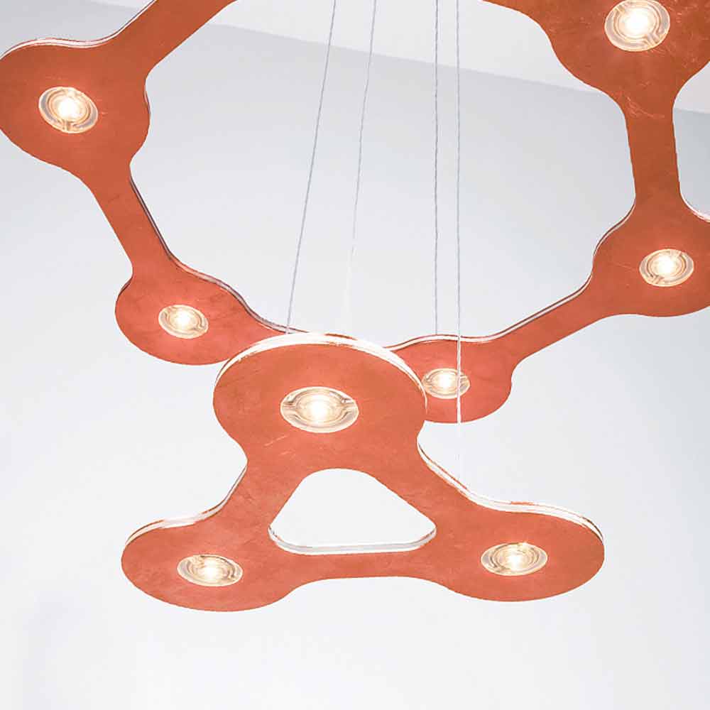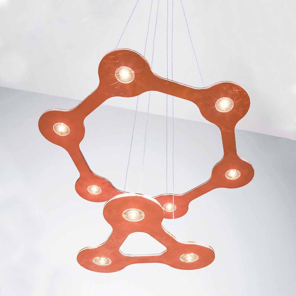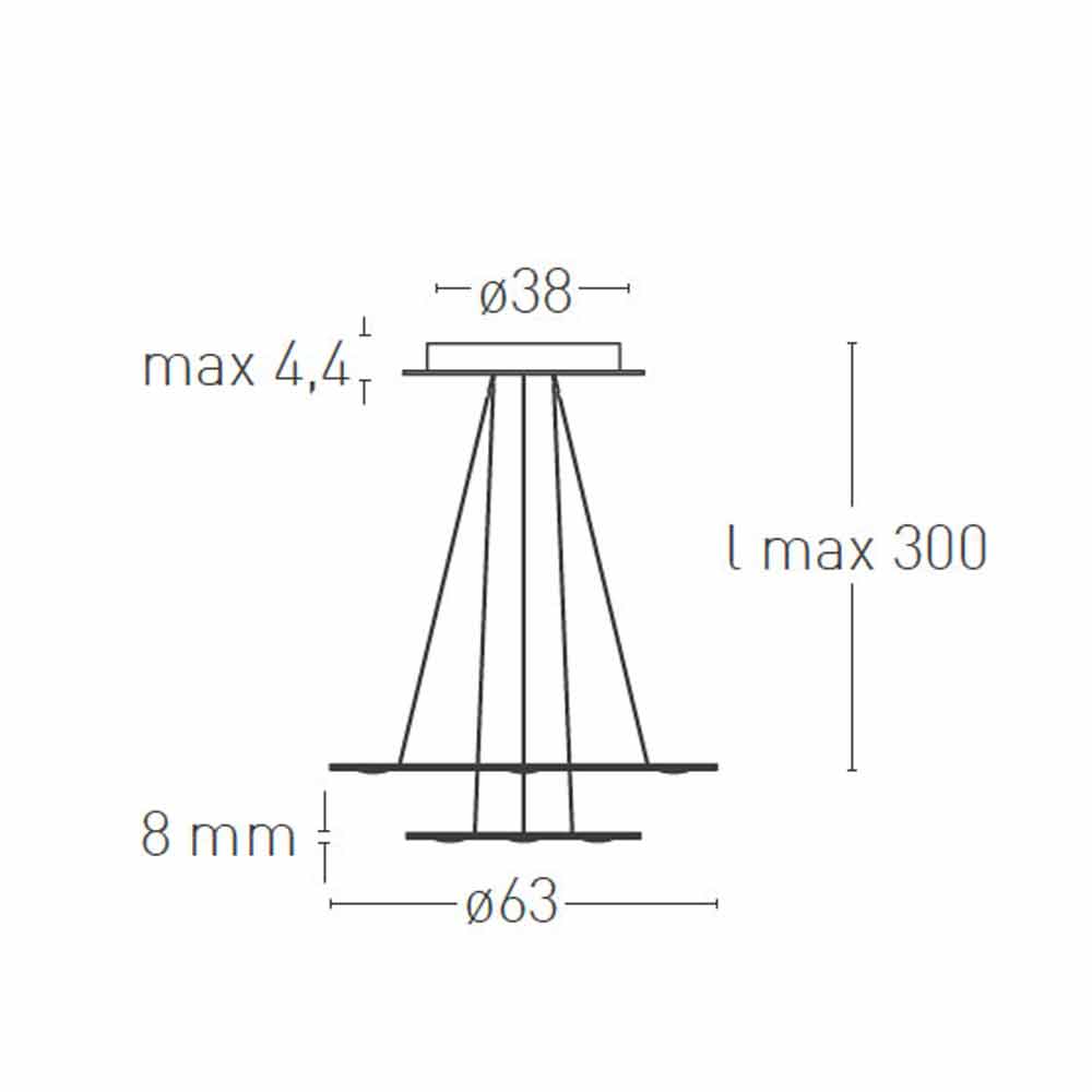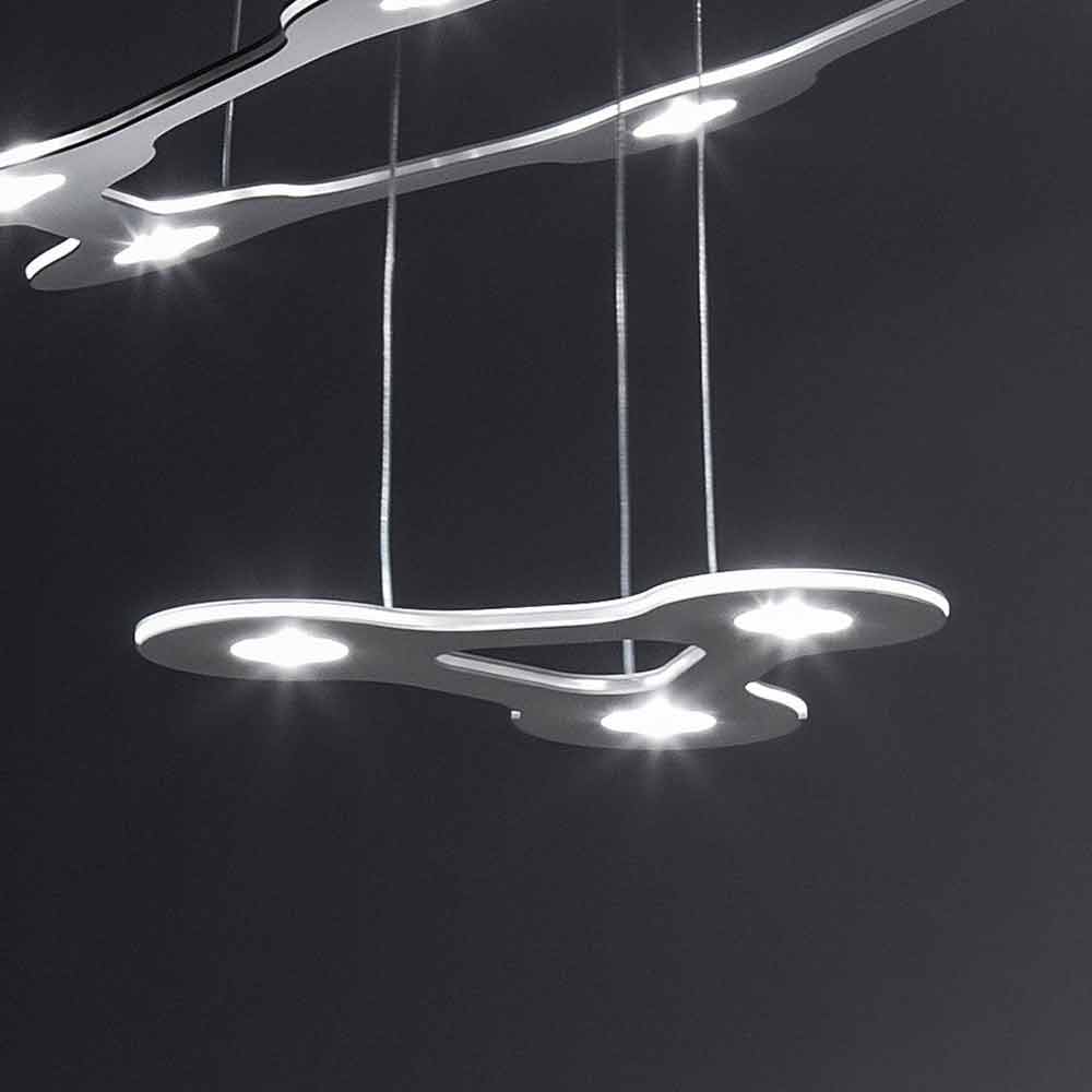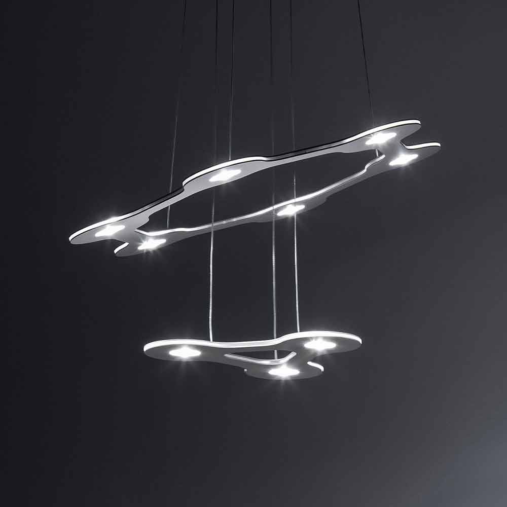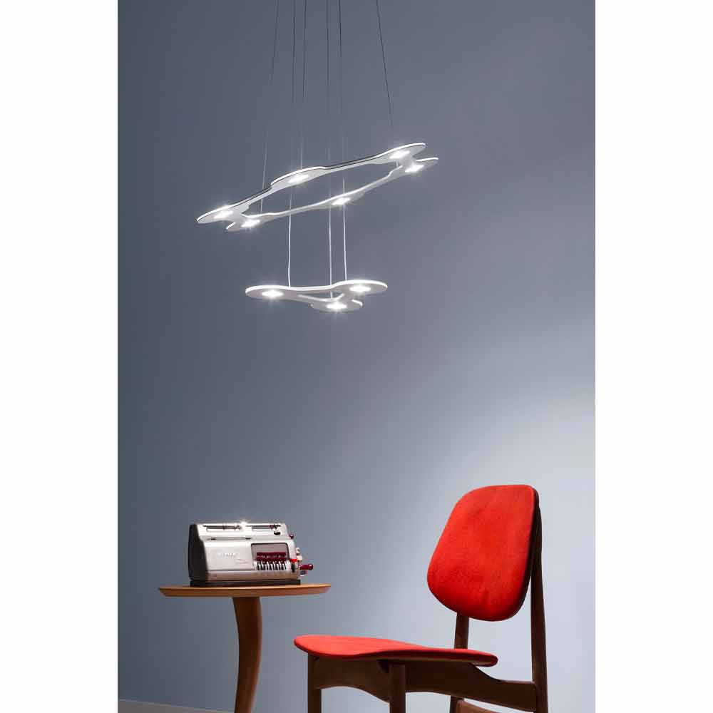 9 lights chandelier made in Italy with aluminum and methacrylate structure and polycarbonate diffusers complete with 300 cm transparent cable and dimmable electronic power supply included (dimmer not included). A lighting system that minimises the surface and volume of the chandelier body to gain significant advantages in terms of space optimization and lightness. The innovative and functional LED source used provides direct downward light while the methacrylate level allows it to be diffused softly throughout the environment for an optimal result . Its multi-level structure represents the true peculiarity of this eccentric and original chandelier designed to give a quality light source to large spaces such as dining rooms, kitchens or living areas with a contemporary aesthetic in which it is necessary to complete the style with a unique and refined touch .