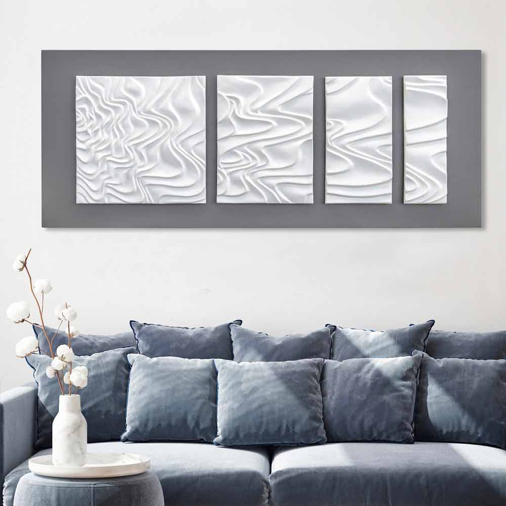 wall installation in composite ceramic is made up of four elements with elegant queues and modern shapes in ivory white mounted on a canvas frame lacquered quartz grey.
