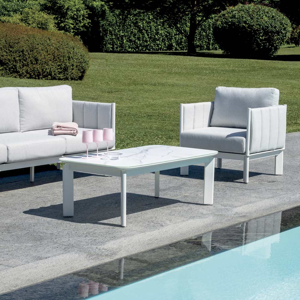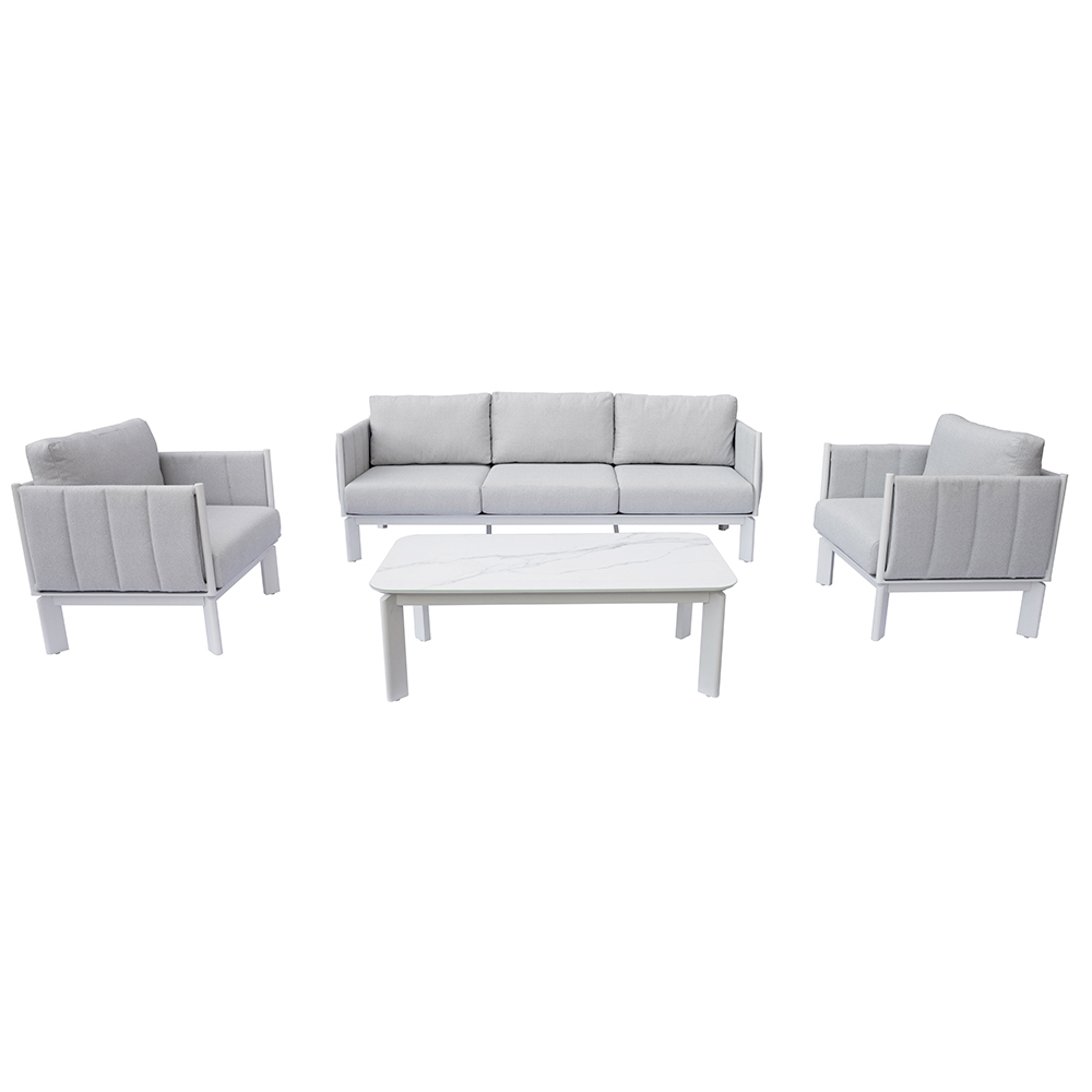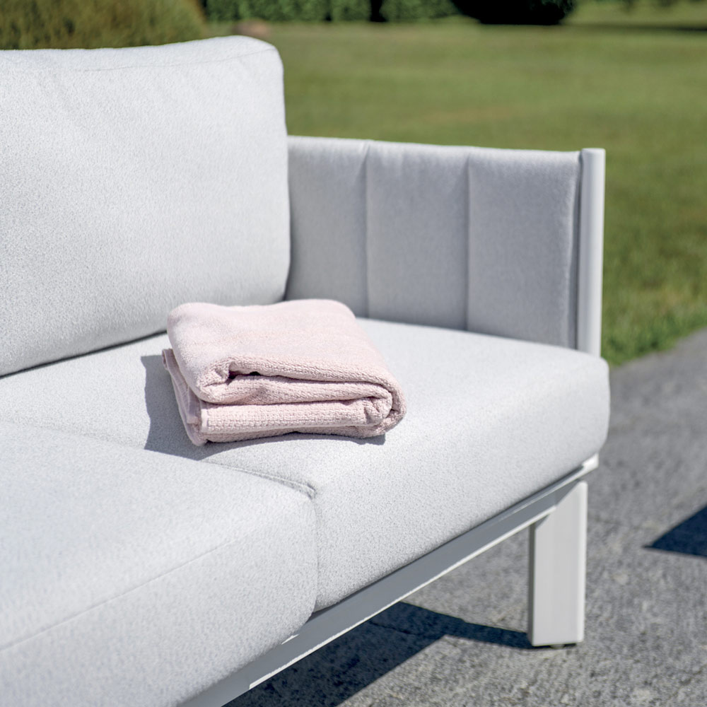 The white aluminum frame lends brightness and durability, while the light gray fabric padding adds a touch of softness and comfort. The removable cushion covers , also in light gray, allow for quick and easy maintenance, keeping the living room always tidy and impeccable.