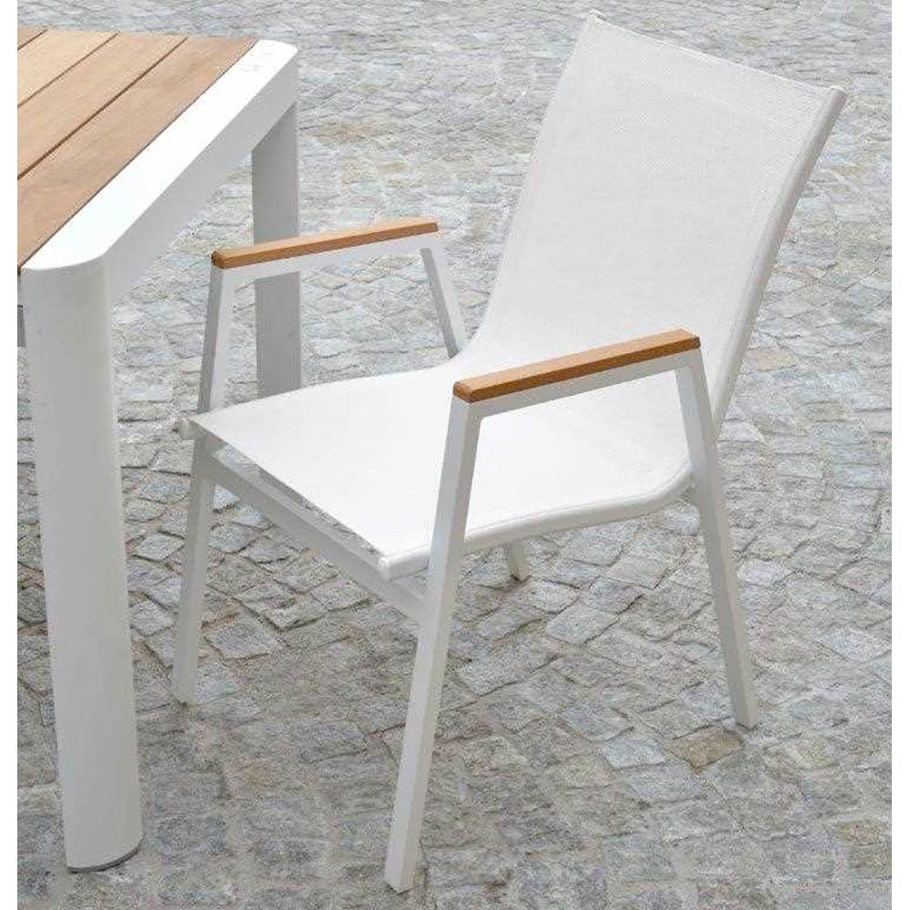 This powder-coated aluminum frame armchair combines style and functionality, perfect for completing any modern outdoor space. The textilene fabric ensures resistance to the elements and long-lasting comfort, while the wooden inserts on the armrests add a touch of warmth and elegance.