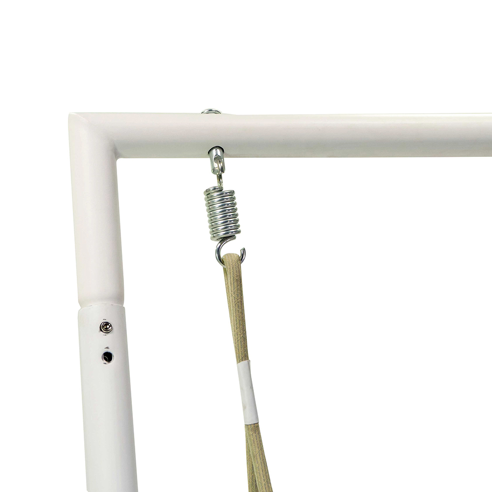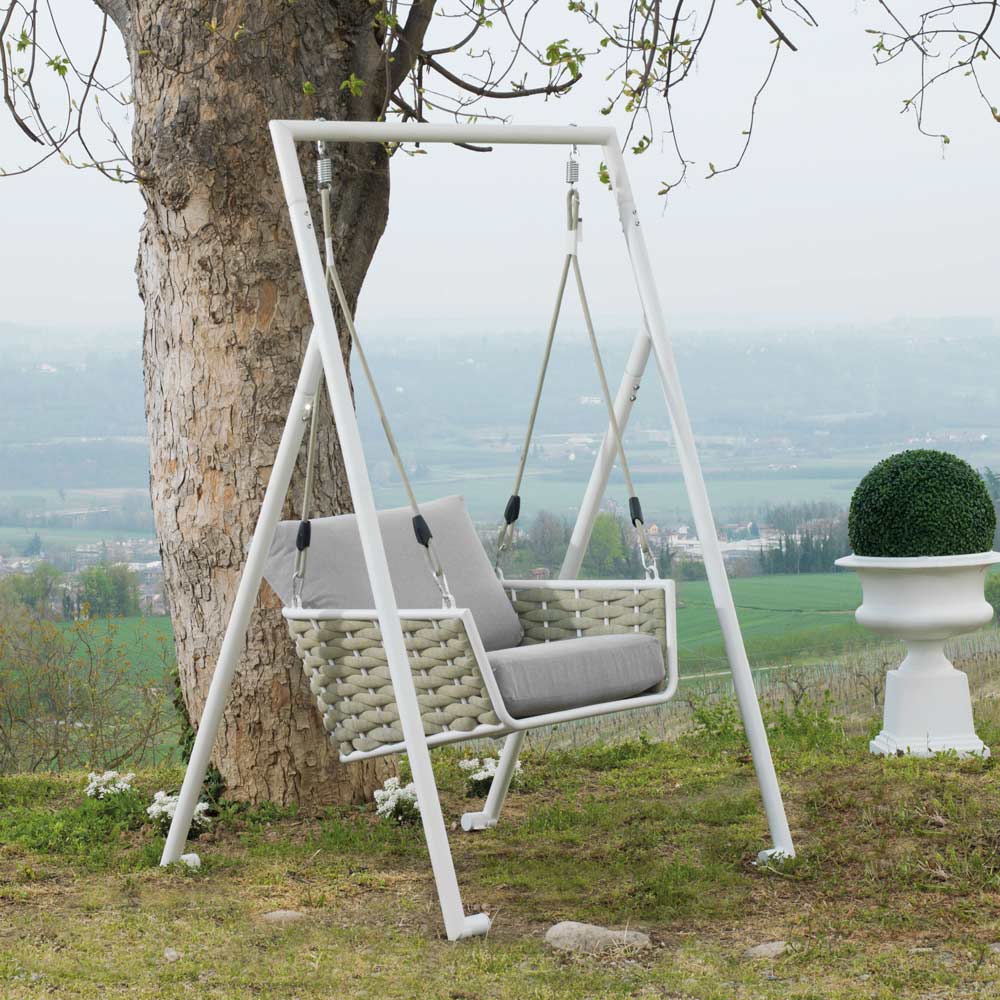 The swing is completed with thick and comfortable cushions in water-repellent fabric, which invite long afternoons of reading or serene coffee breaks. The modern and minimalist design, accentuated by the clean queues of the white structure, fits perfectly into any outdoor environment, adding a touch of contemporary style .
