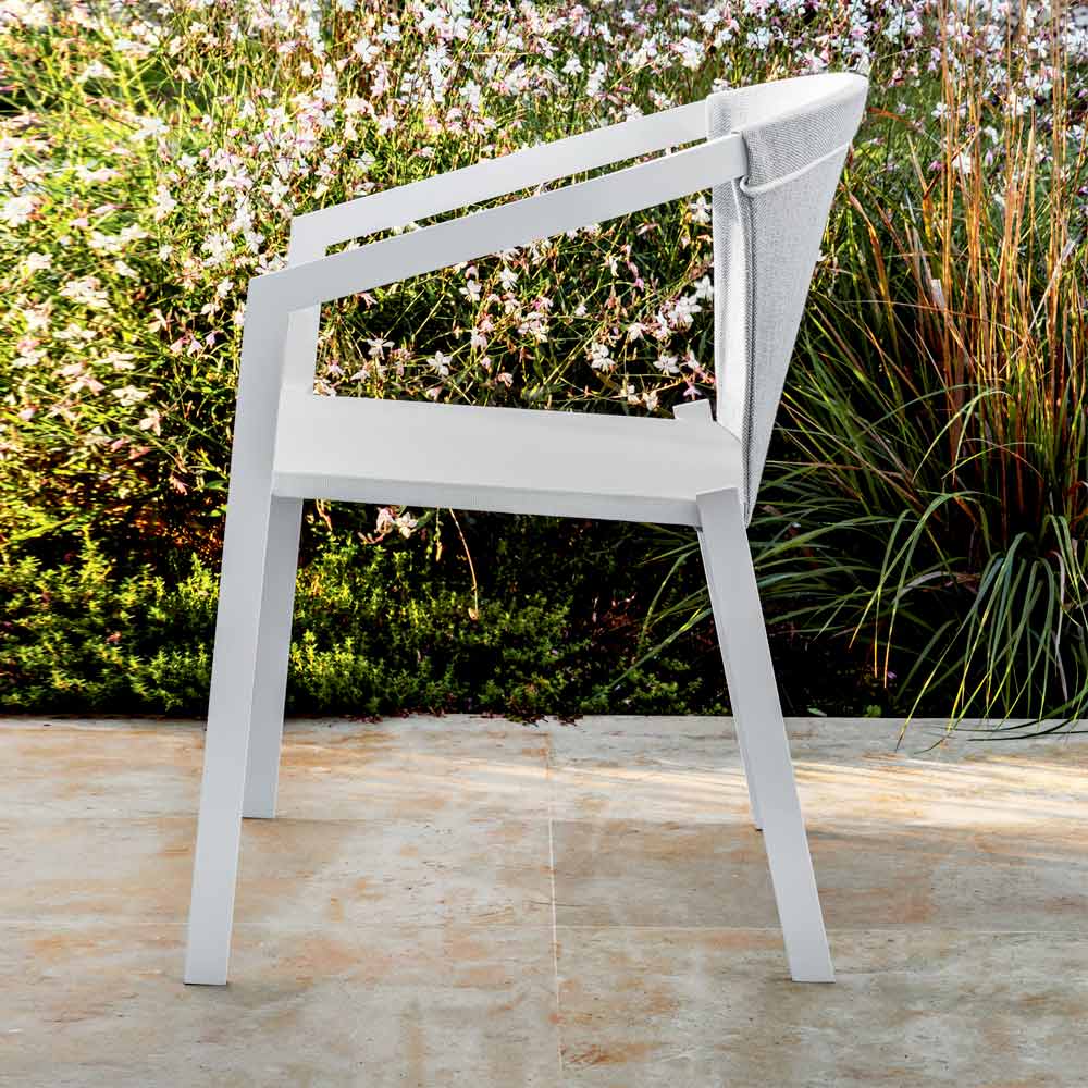 Stackable outdoor chair in aluminium, textilene and fabric cushion, high quality made in Italy, 4 pieces.