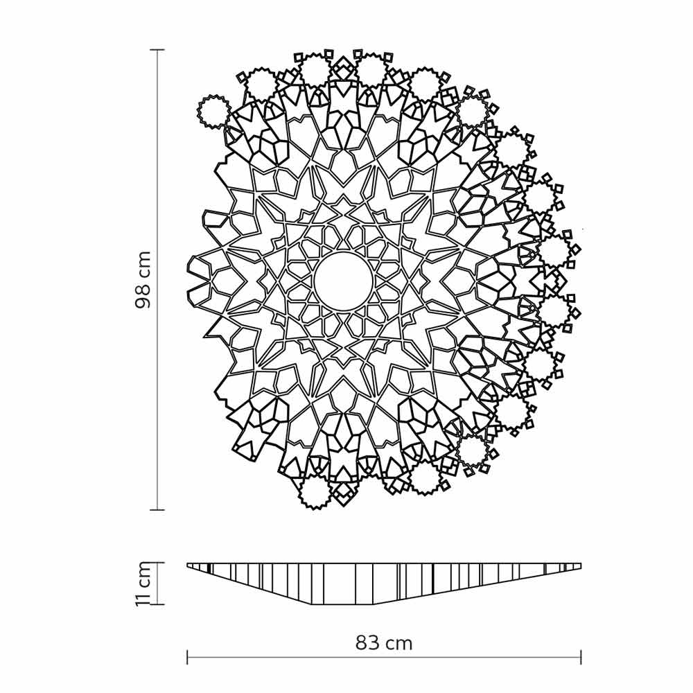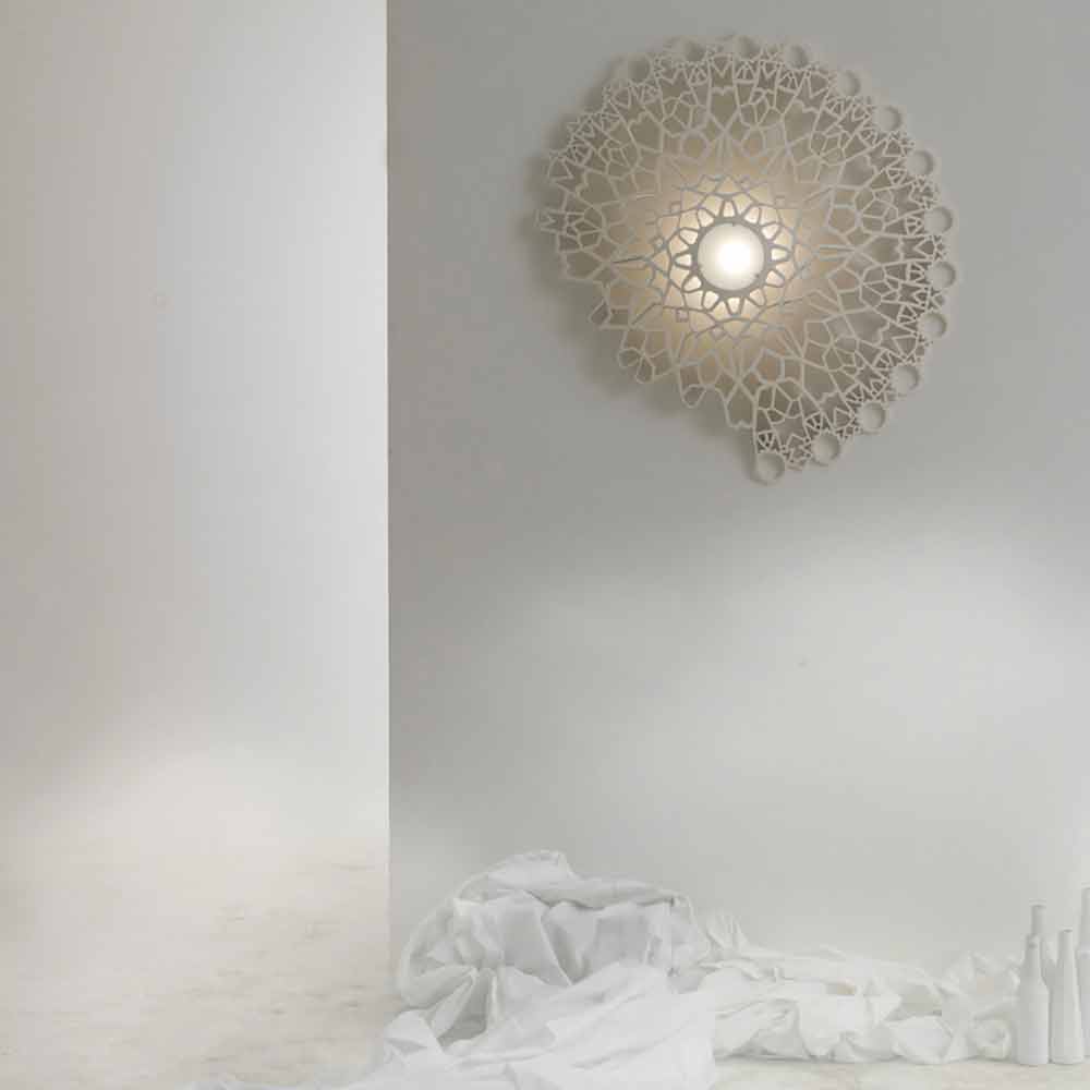 This original and singular ceiling or wall lamp evokes the charm of natural light that radiates between the decorated rose windows of the Gothic cathedrals, creating suggestive and emotional atmospheres.