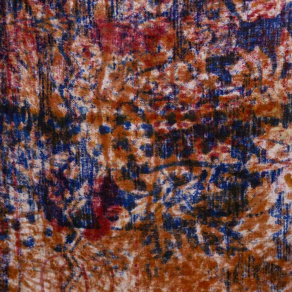 - Hand print: This phase lasts for months. The fabric is placed on the workbench below the various products that in months and months of work will alternate and be printed. The various colours and designs will be transferred "spontaneously" to this fabric due to the pressure of the wooden mould, and will overlap. The end result will be an explosion of unpredictable and unrepeatable colours and shades.