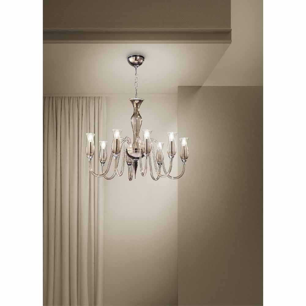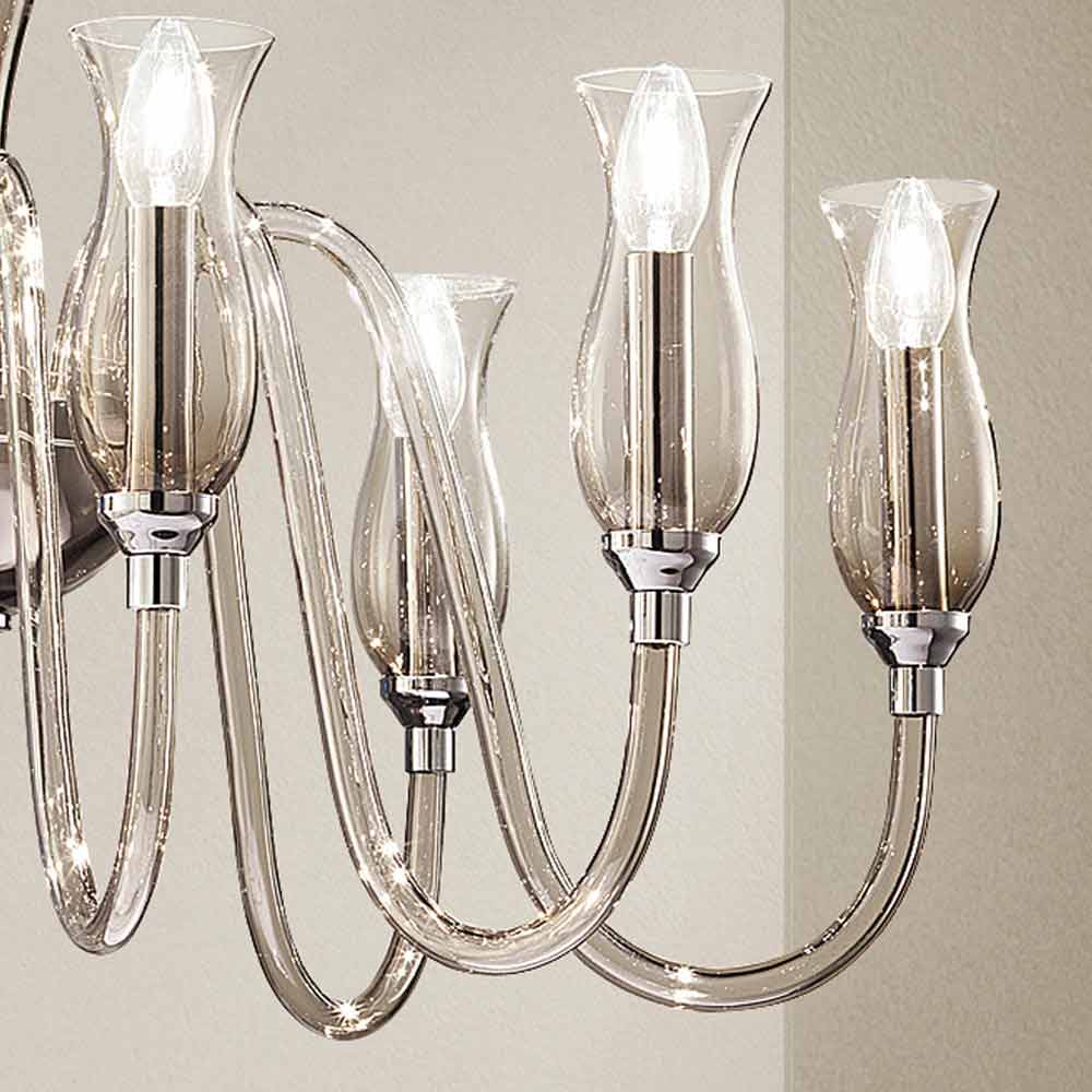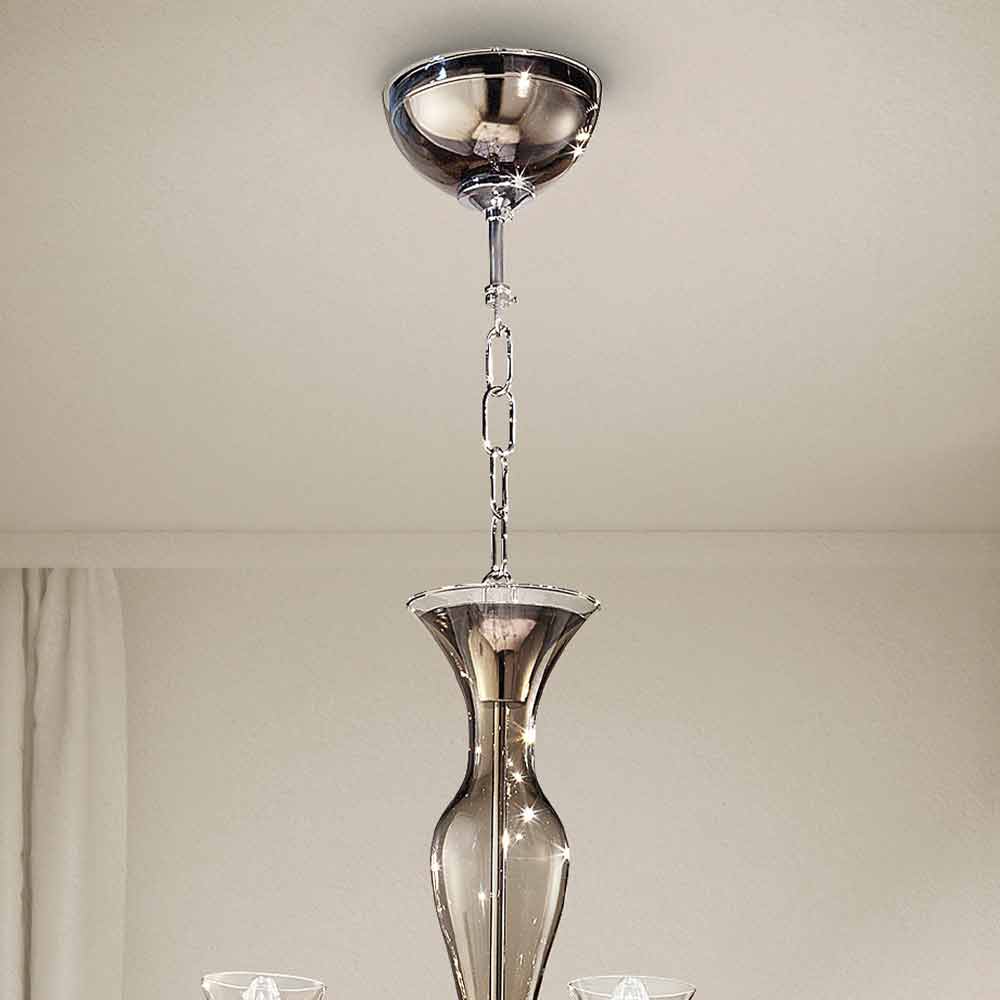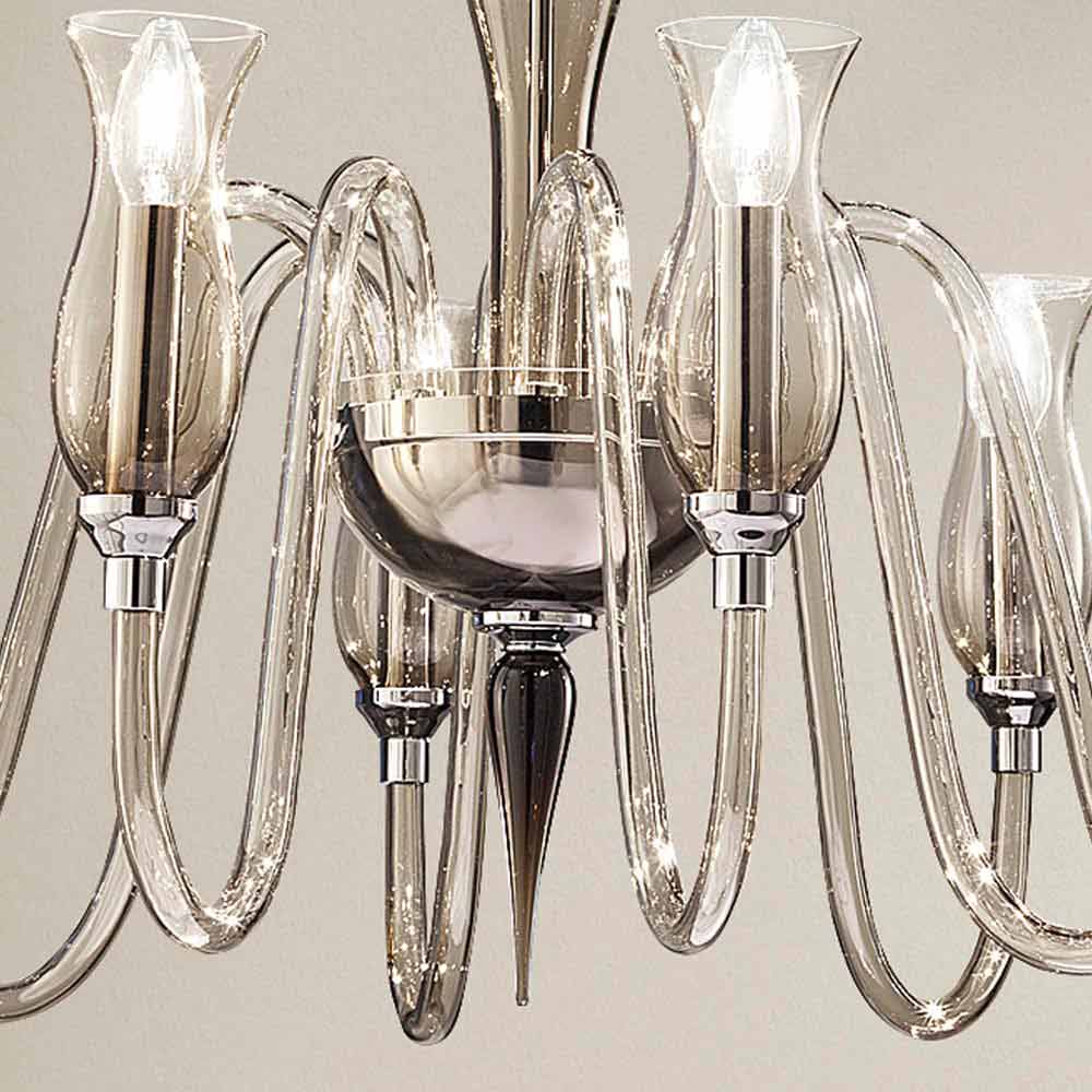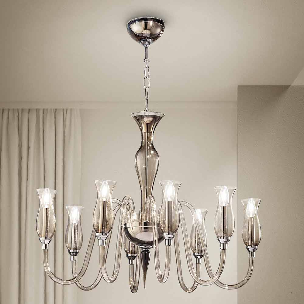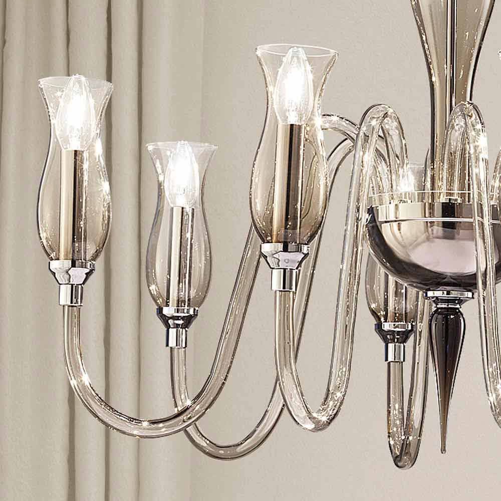 Refined 8-light chandelier in hand-crafted Venice glass in smoked finish with details in polished chromed metal , handcrafted in Italy. The majesty that underlines its shapes makes it the protagonist of the scene, ideal to be placed in the centre of the room, in a lounge or in a large classy bedroom for suggestive and romantic atmospheres. Its peculiarity is represented by the smooth surface of the glass that highlights the play of transparency and the wonderful vibrant effects of light for a result with a strong visual impact.