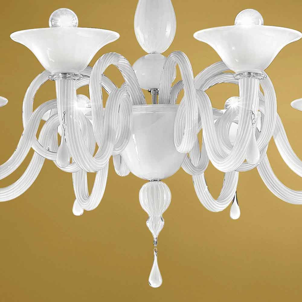 Refined classic chandelier made of colored glass handmade in Venice with metal details in polished chrome finish . From the encounter between tradition and innovation, a piece of furniture with a unique aesthetic is born that embodies all the elegance of classic queues typical of an ancient style revisited in a contemporary key to give life to extravagant lighting. Ideal for giving light to large spaces in the house, this chandelier stands out for its futuristic aesthetic thanks to the wonderful milky white finish that covers the entire structure. To enrich the design and to increase its value is the unprecedented shape of the arms modelled during the processing of the blown glass for a creative and fascinating result .