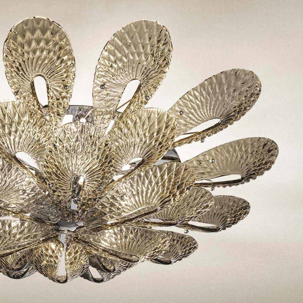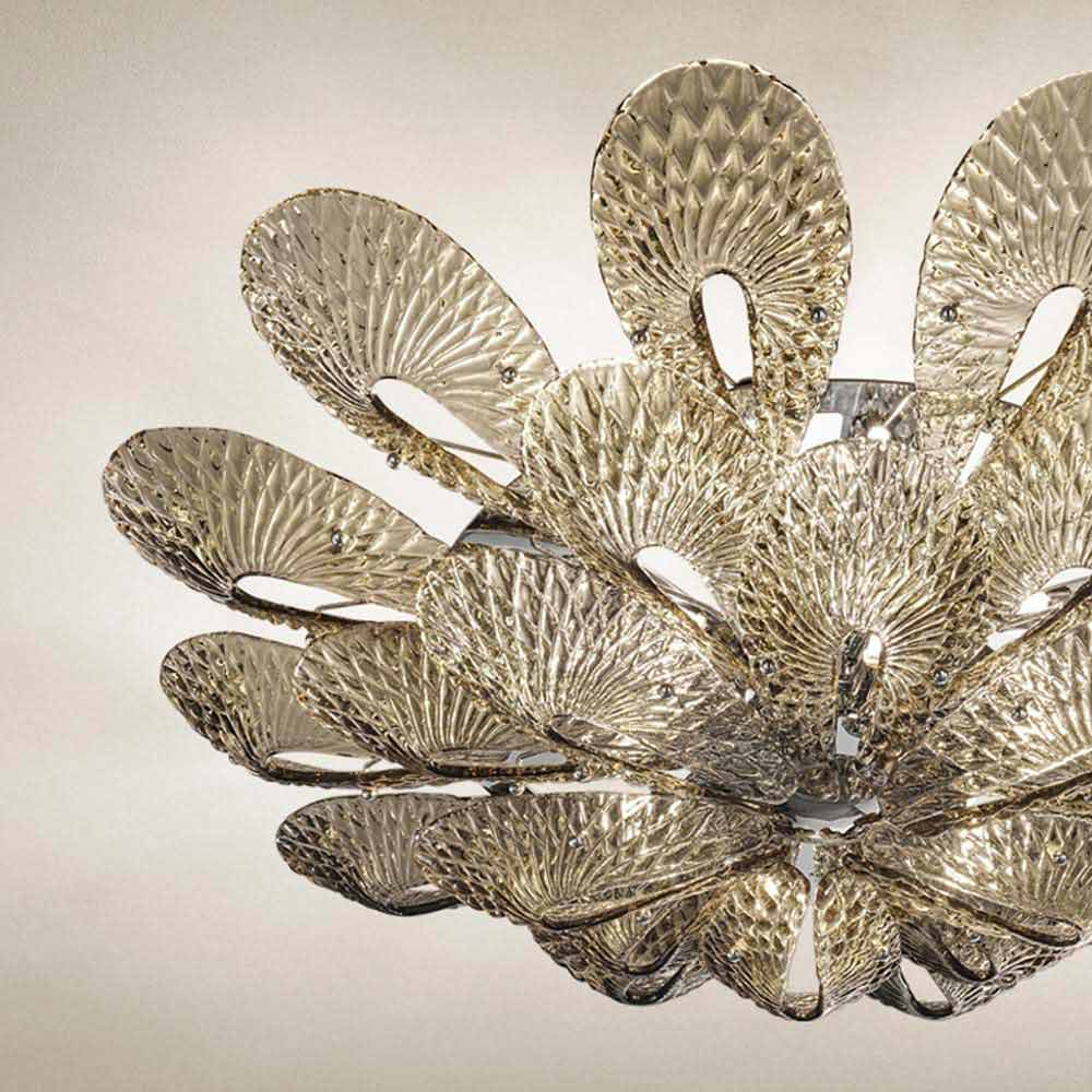 Majestic and elegant ceiling lamp made in Italy in Venice in hand-worked colored glass with smoky finish and details in polished chromed metal . A design outlined by unprecedented shapes that crystallize to give life to delicate glass ribbons which, when united, converge in a luminous fulcrum. Its aesthetic stands out thanks to its refinement of style that perfectly adapts to environments with contemporary furnishings and gives character to spaces with a more classic taste, proving to be eclectic and versatile . To enrich its value is the particular diamond pattern that covers the entire surface, creating exclusive plays of light .
