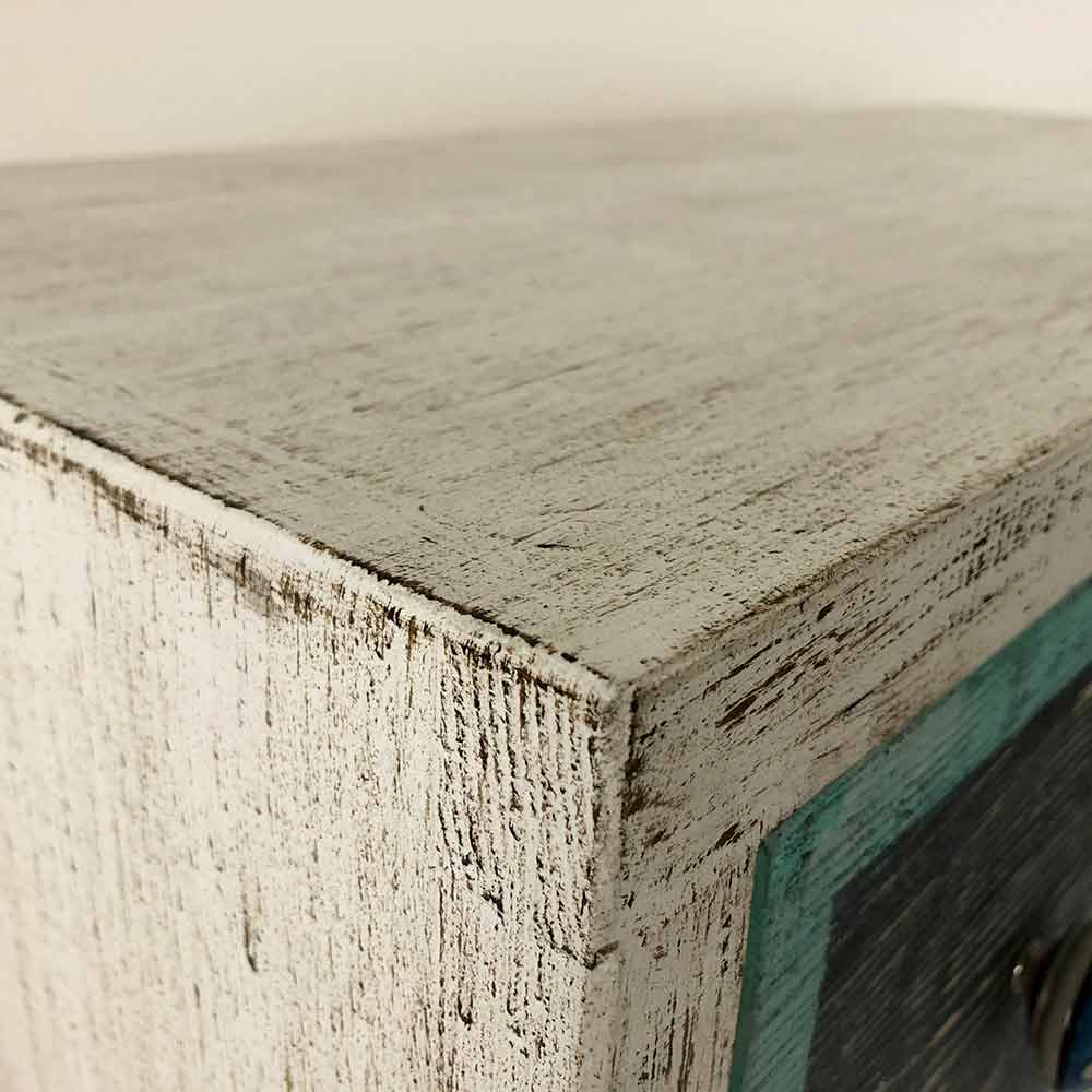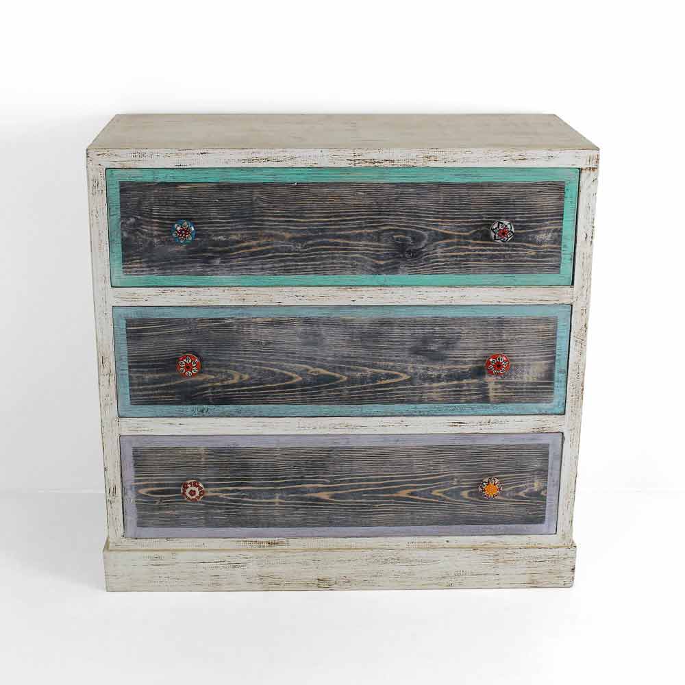 Handcrafted chest of drawers made in Italy in solid fir wood with 3 drawers in poplar plywood with hand-painted wooden front and ceramic knobs. The structure of the product has an aged white finish while the drawers are decorated in flayed black with colored edges. These wonderful colours are obtained thanks to the use of natural lands aggregated with glues of animal origin, materials chosen as an alternative to common industrial paints. This is done in an attempt to minimise the use of formaldehyde, a harmful substance recognized as a carcinogen. In this way it is possible to lower the level of toxicity, thus creating a functional and fascinating product and a healthier atmosphere. The chest of drawers is finally completed with a transparent finish that makes it water-repellent and fixes the colours to make them unchangeable over time.