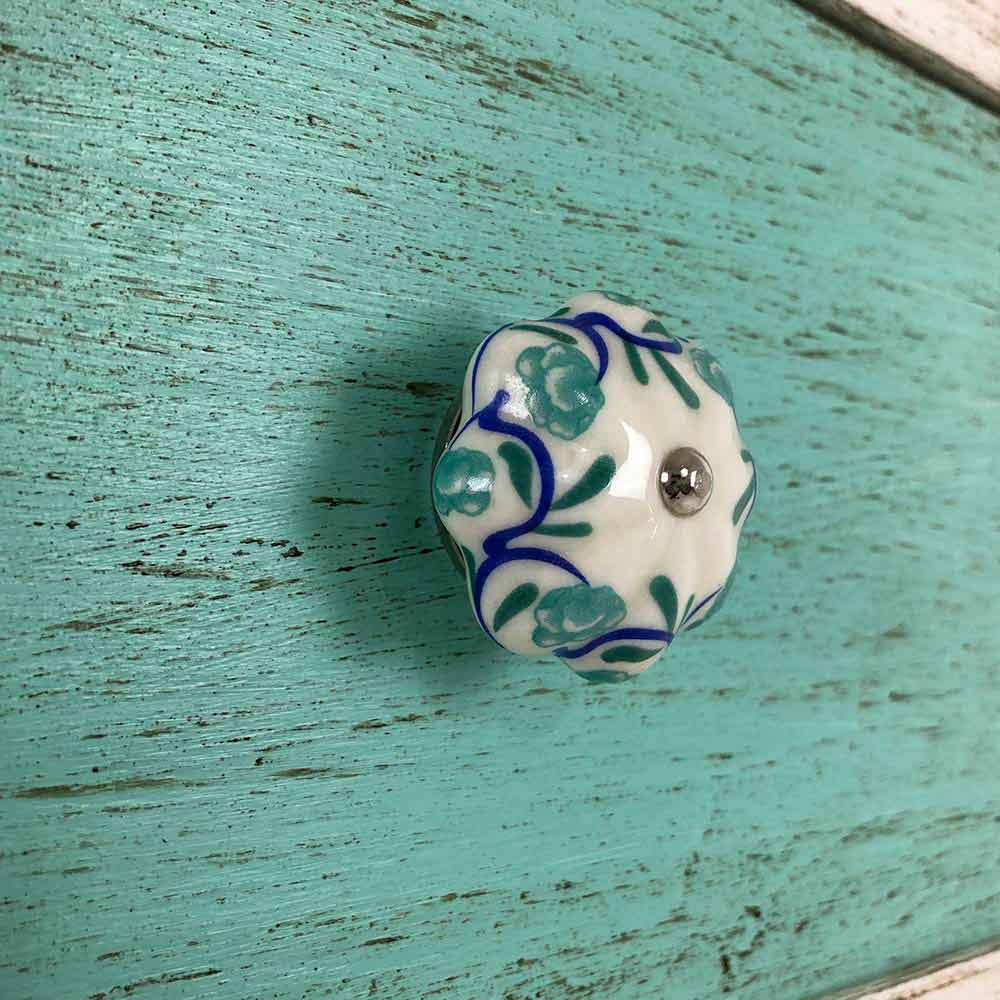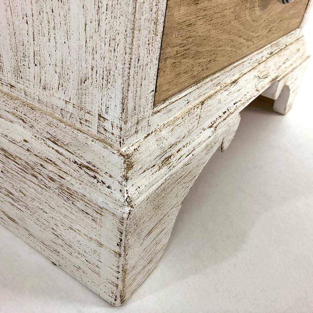 Chest of drawers in solid abet wood and handmade in Italy in aged white finish. The 4 drawers have a 10 mm poplar plywood structure to keep more space inside them, while the front panel is in 18 mm wood and is completed by special hand-painted ceramic knobs. The wonderful colours that enrich the drawers are obtained thanks to the use of natural lands aggregated with glues of animal origin, materials chosen as an alternative to common industrial paints. This choice of construction means that each article can minimise the presence of formaldehyde, a harmful substance classified as a carcinogen. The chest of drawers is finally completed with a transparent finish that makes it water-repellent and fixes the colours to make them unchangeable over time.