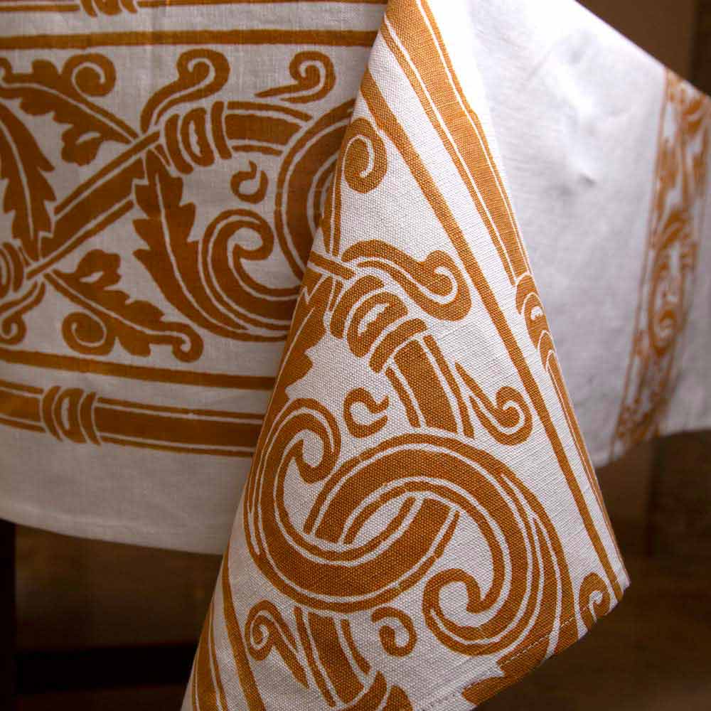 Highly crafted Italian linen and cotton tablecloth, made with fine and artistic hand print in rust colour along the edges and centre, handwork on exclusive antique fabrics, made in Italy.