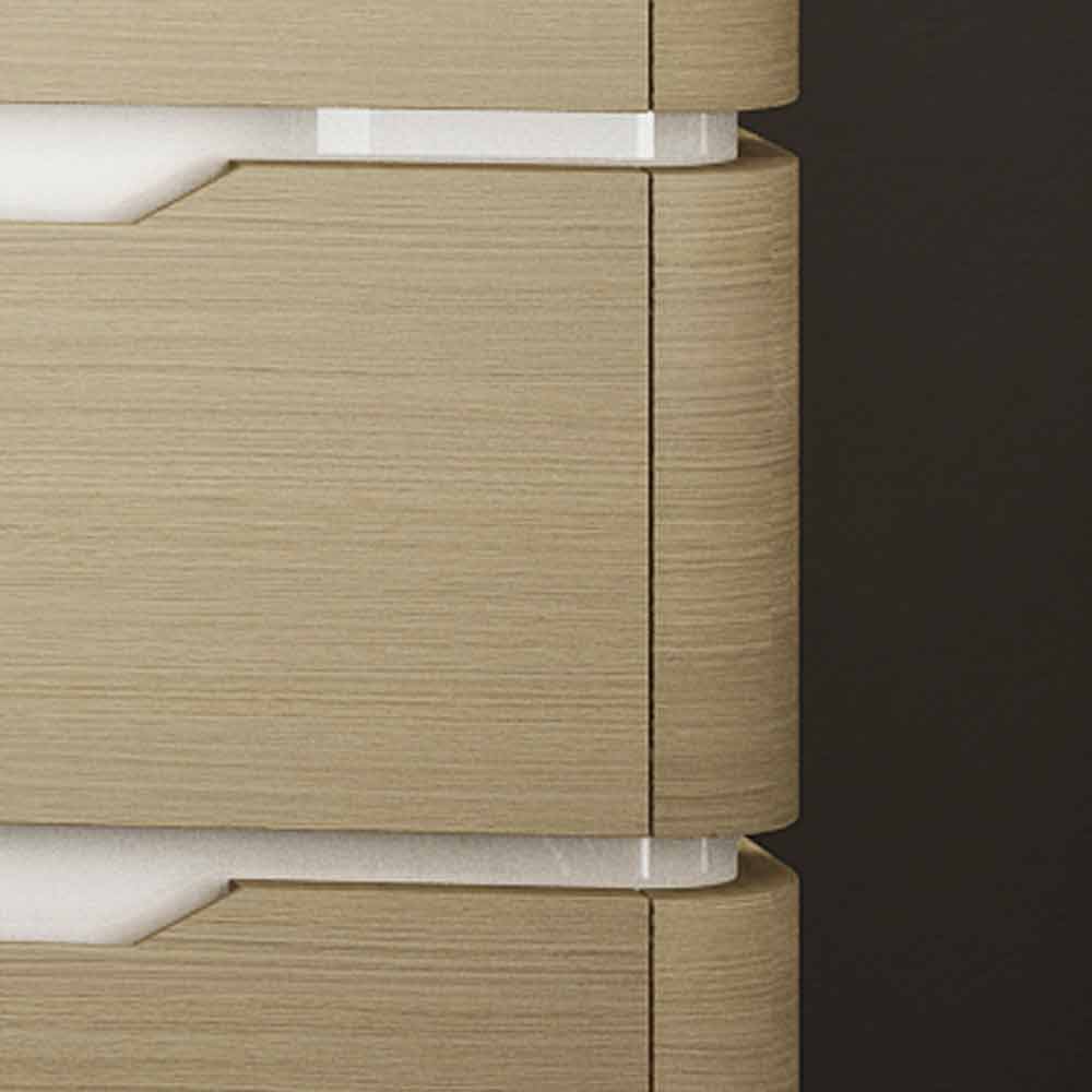 Elegant bathroom vanity with 3 curved drawers. This modern design bathroom vanity is made of lacquered wood, with natural wood inserts.