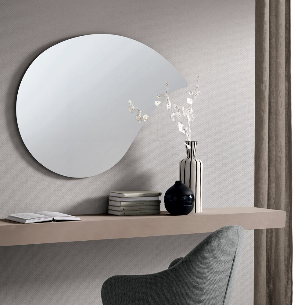 The soft, elongated shape gives the mirror a light and harmonious appearance, capable of enriching the wall with a refined graphic touch. This essential design allows the mirror to become a decorative element capable of amplifying light and creating depth in the space.