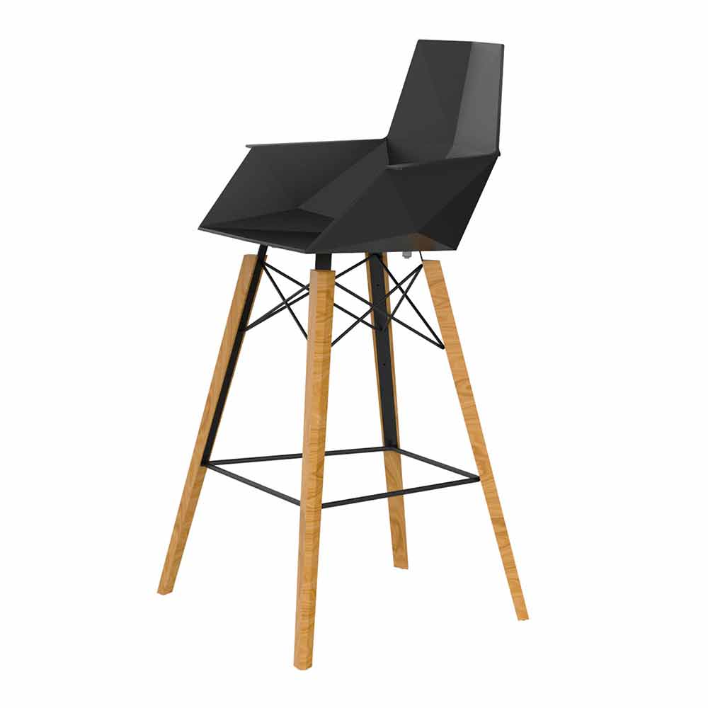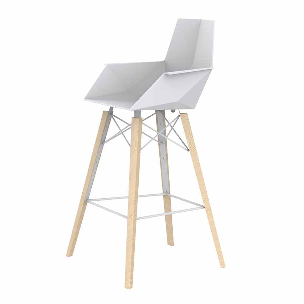 Bar stool with structure in ash wood and seat and backrest and armrests in polypropylene in various colours.