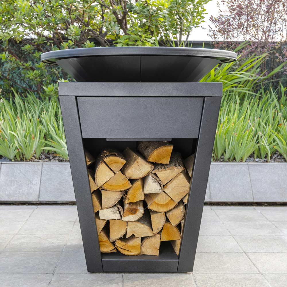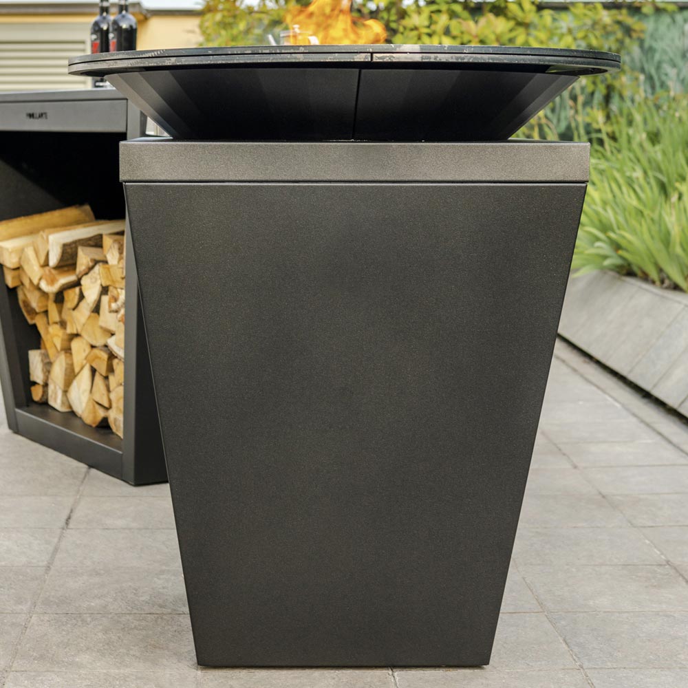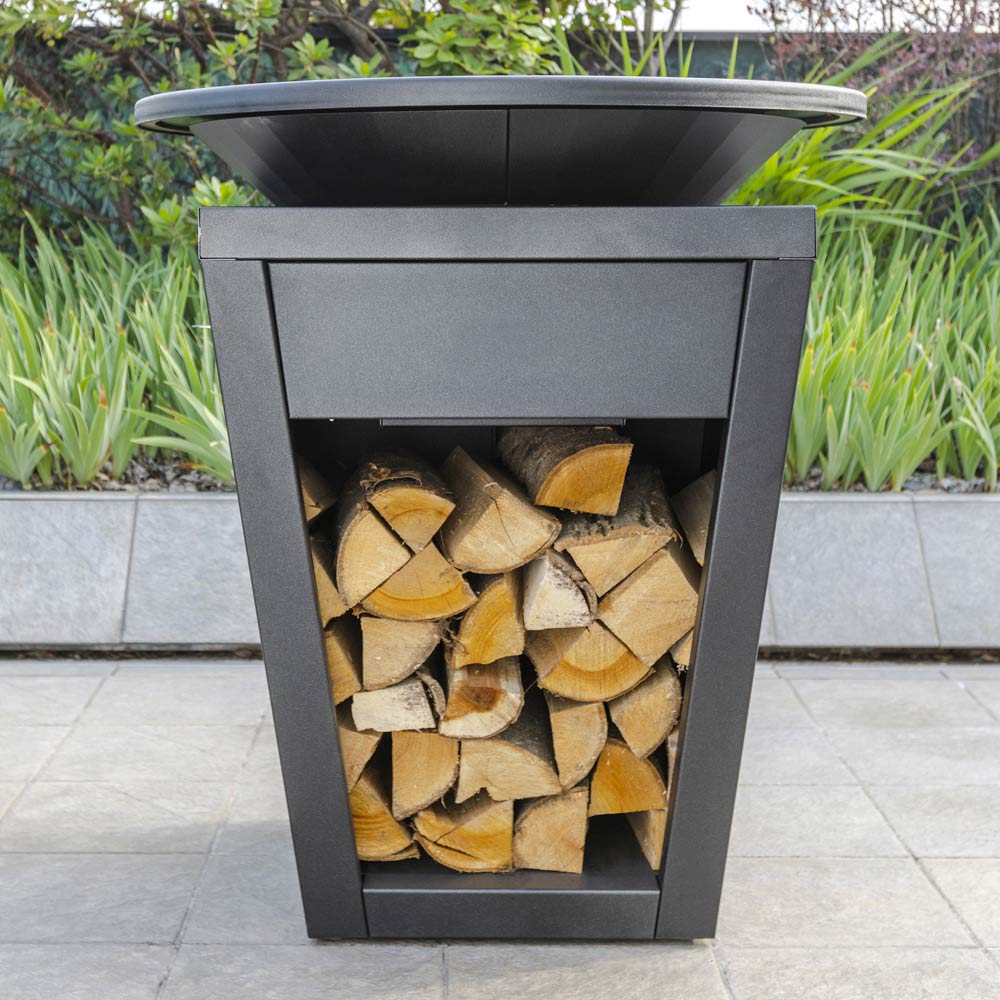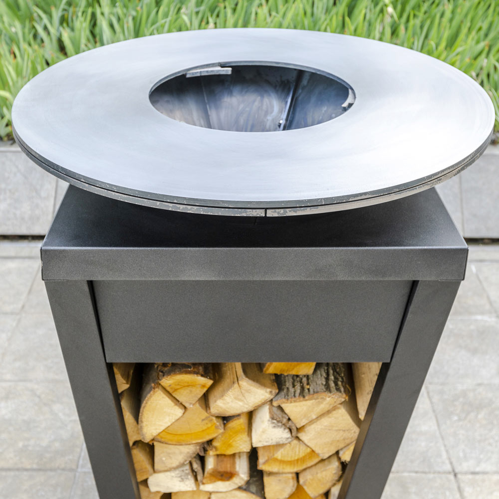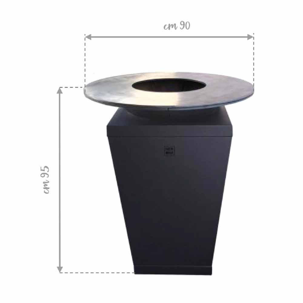 Outdoor wood burning braai of design multi-equipped: wood compartment, cooking plate, ash compartment and vent.