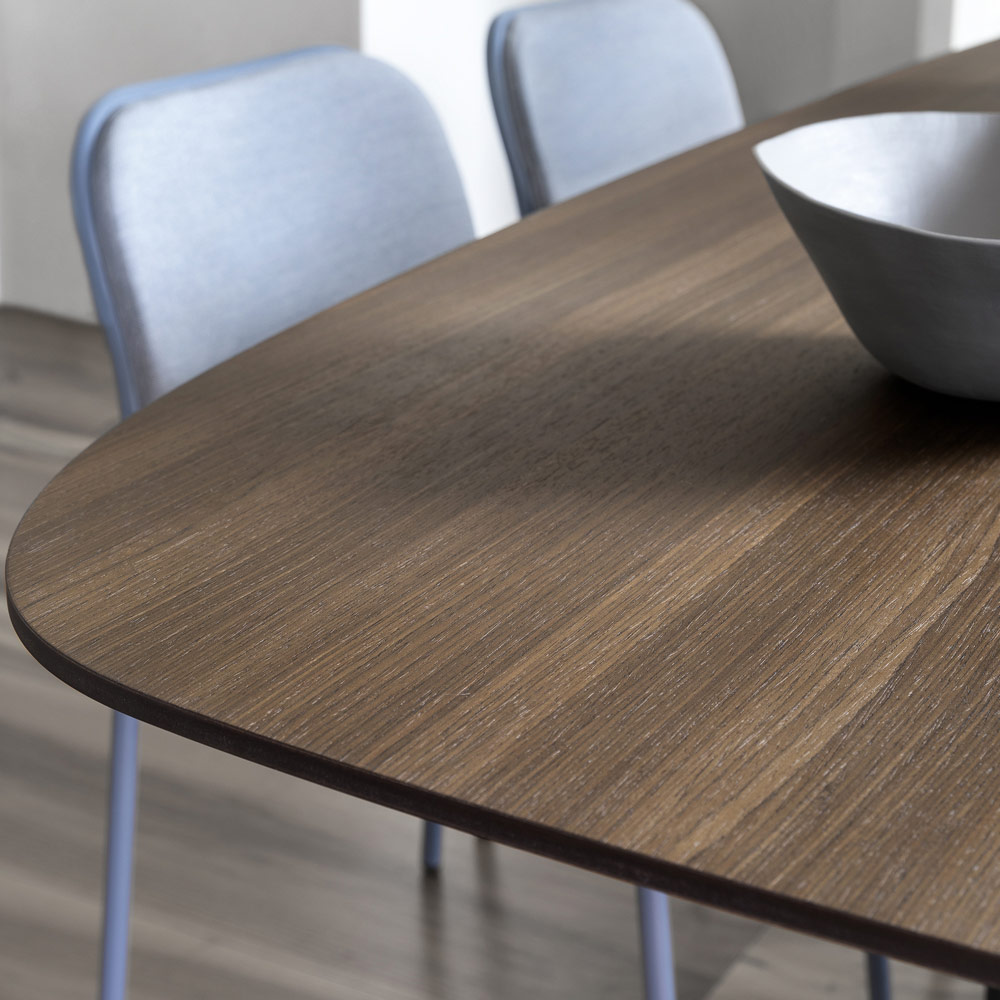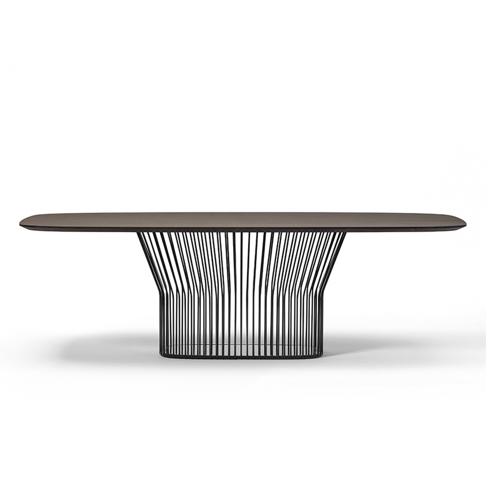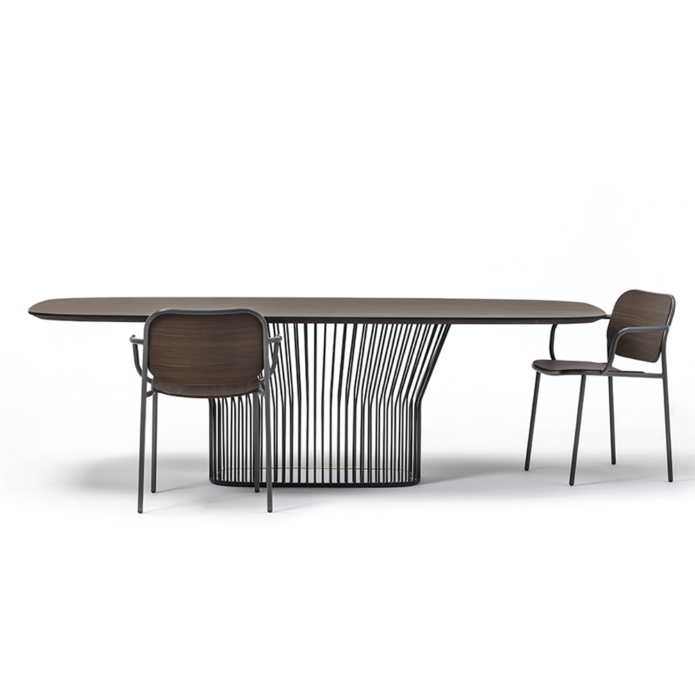 dynamic style and composed of many rays of different widths that fold outwards at the top and then open to support the top. The dimensions proposed together with the different finishes for the top allow this wonderful piece of furniture to prove to be particularly versatile and therefore able to complete any space, conquering the centre of attention through its contemporary soul and its refined taste.