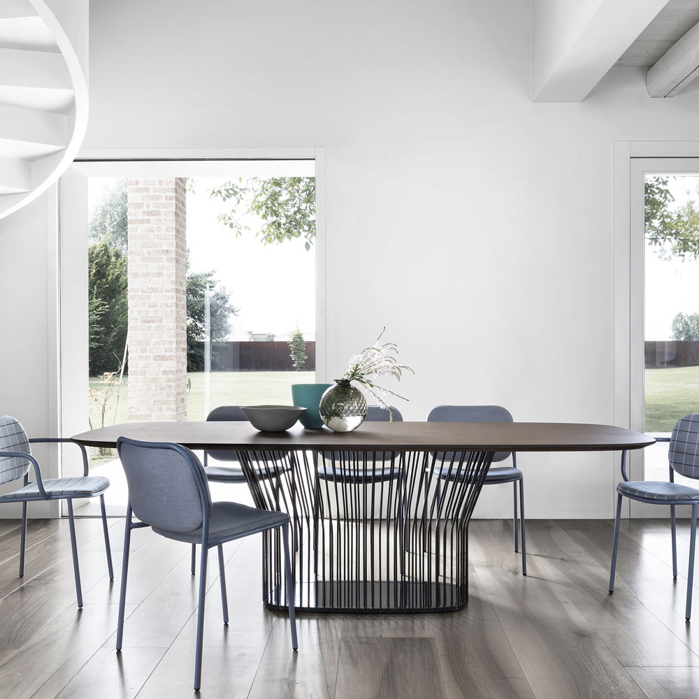 Barrel-shaped dining table in wood and black metal Made in Italy.