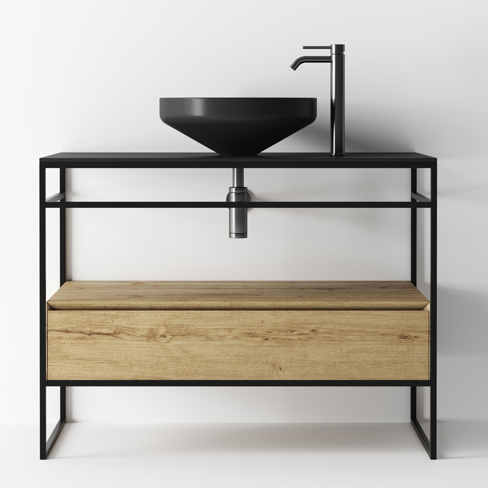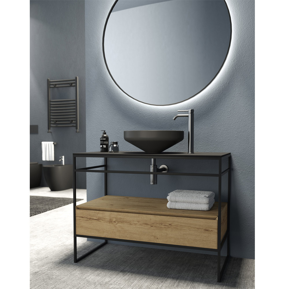 Bathroom furniture composition completely made in Italy consisting of a ceramic washbasin in matt black finish, base with structure in matt black stainless steel and top in matt black ceramic with practical drawer in oak finish wood with 45 ° cut and slow closing. The composition is completed by the round backlit wall mirror with aluminium frame with matt black finish.