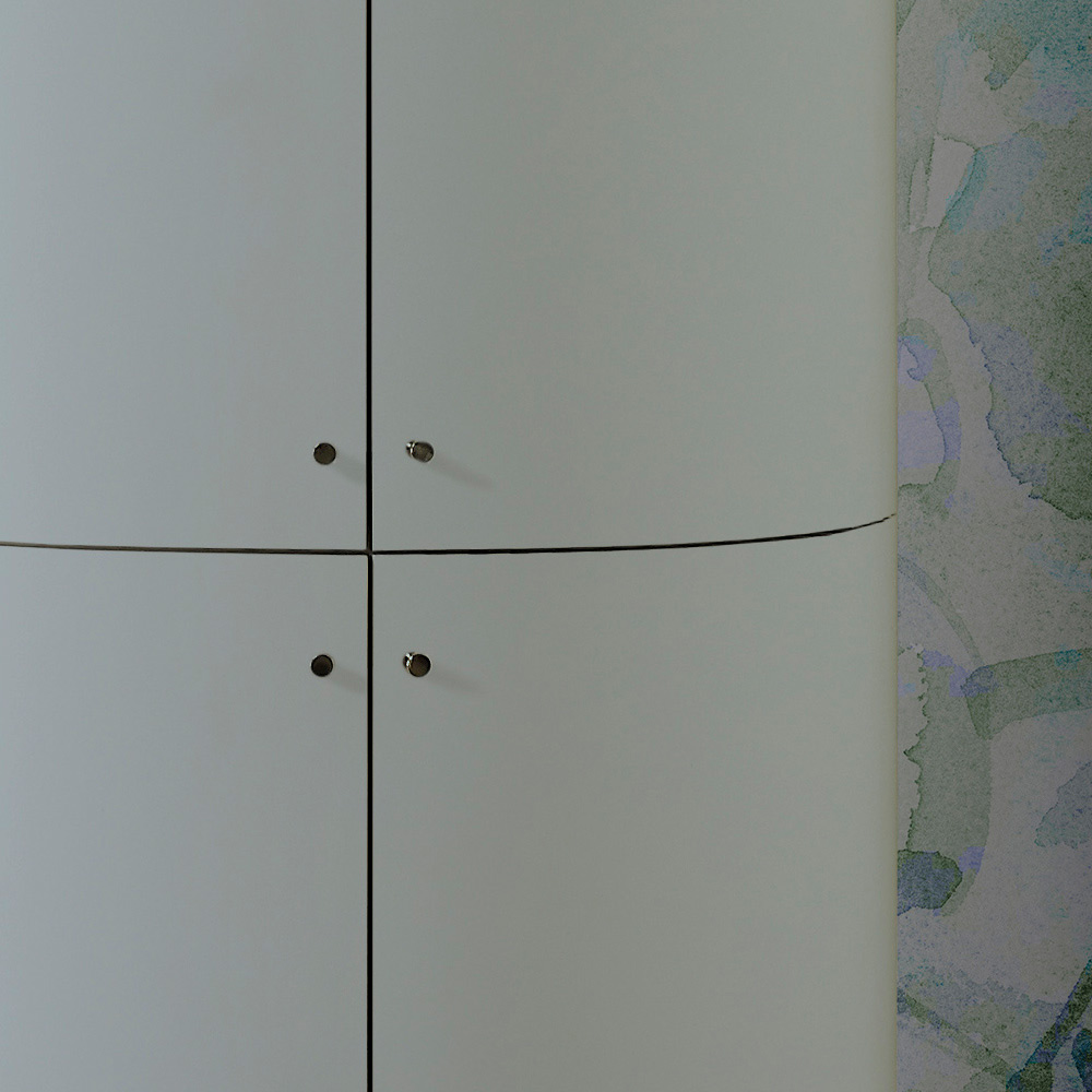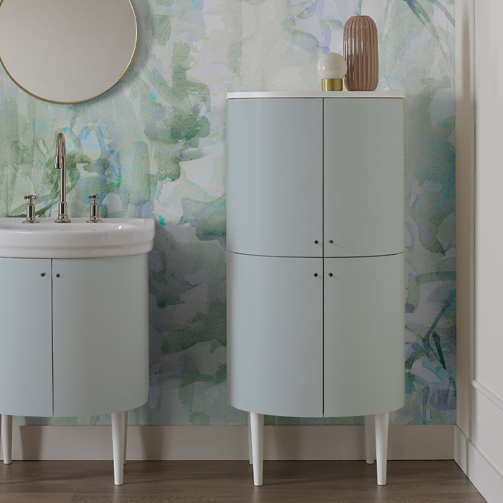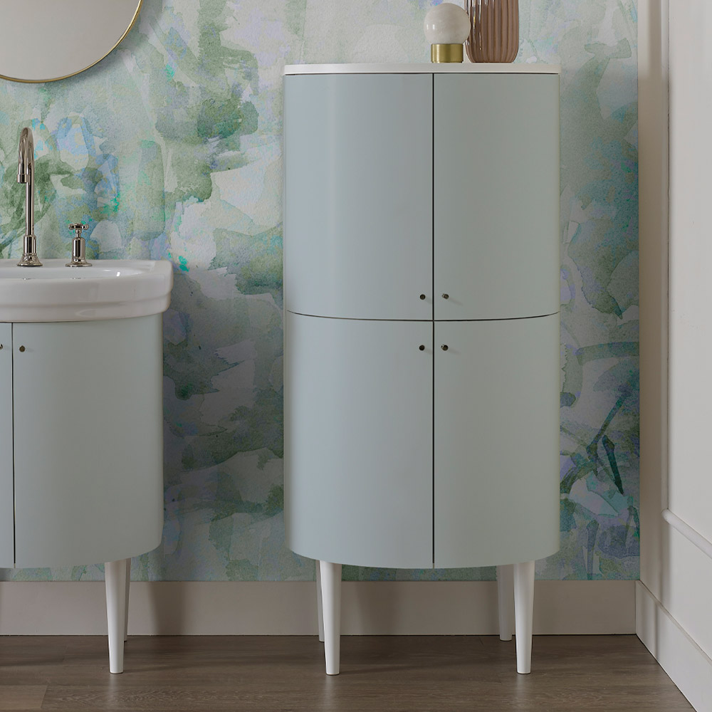 MDF column with four doors light blue matt finish which close off three shelves, two of which in glass and one in Hydro MDF. The top shelf and the legs are in a matt white finish and the knobs are included in a nickel finish.
