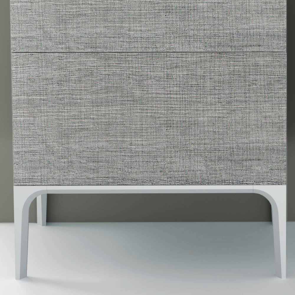 Elegant washbasin unit with 2 drawers with solid and harmonious queues in eco-wood with feet in pearl grey solid wood. Integrated ceramic top. Available in different finishes. The Ambra bathroom cabinet expresses elegance and calibre between modernity and tradition with warm, solid and harmonious architectures and feet with multi-faceted surfaces in solid wood.