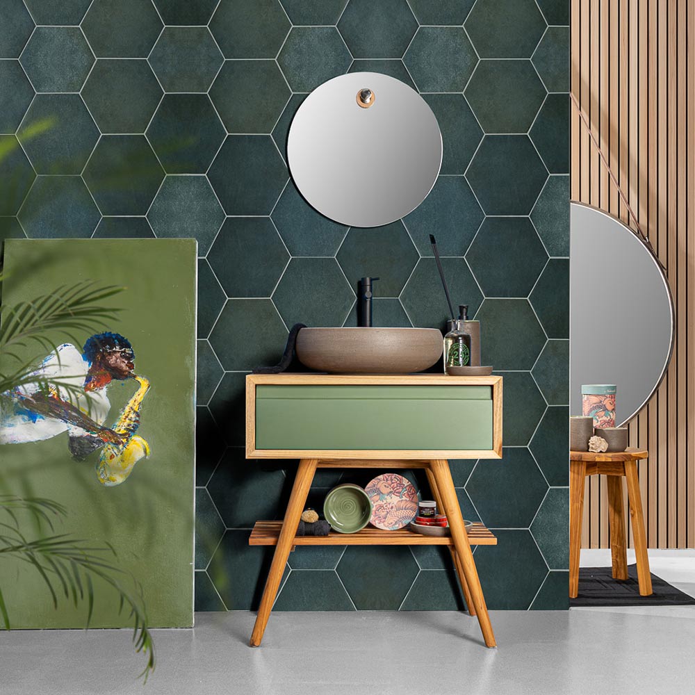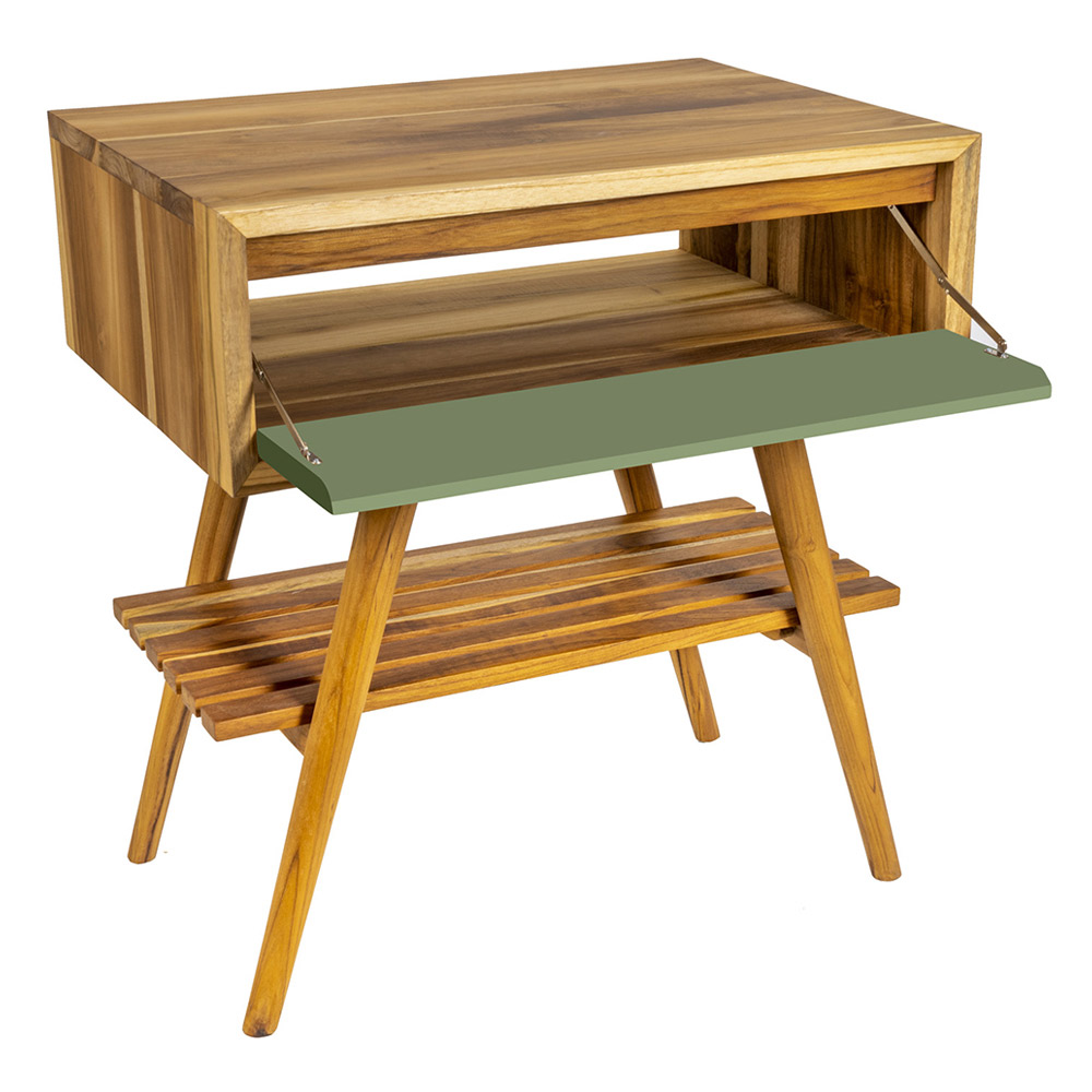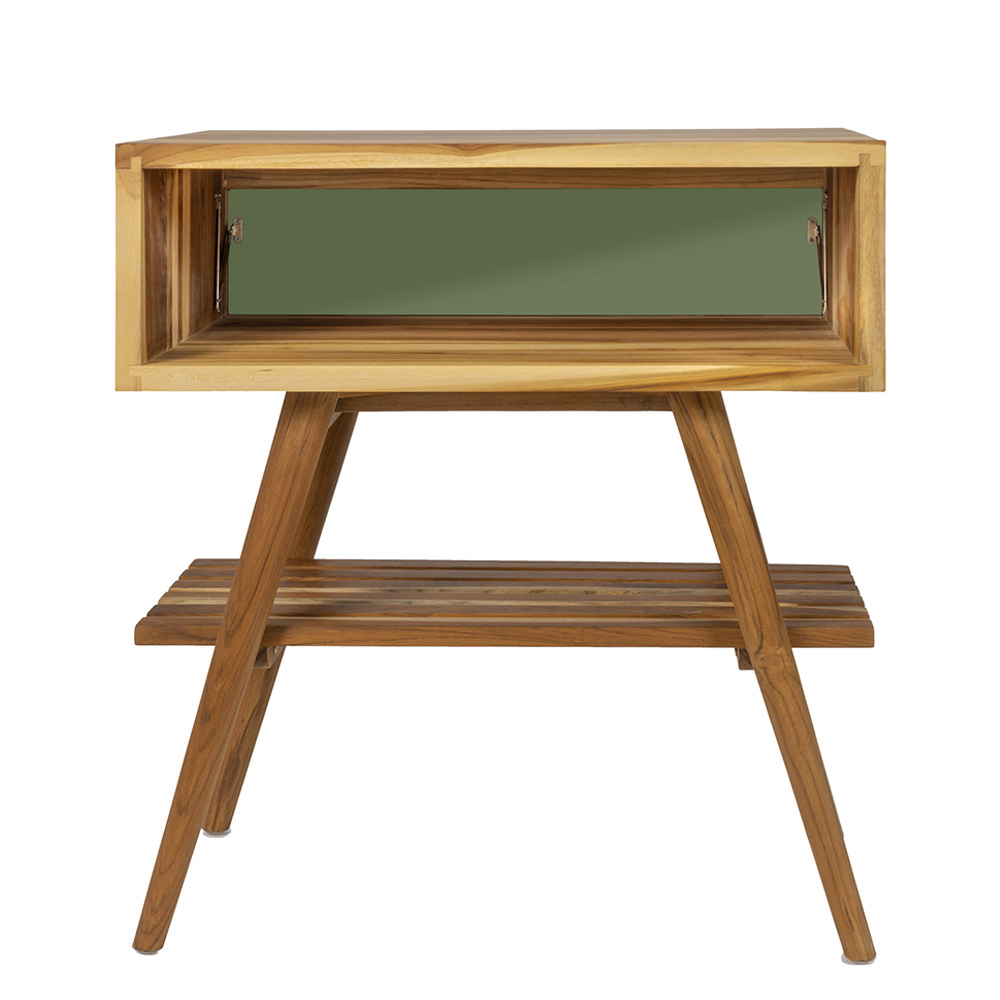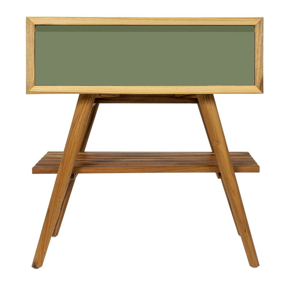 Floor-standing bathroom cabinet made of natural recovered teak with flap drawer in green mahogany wood , a nuance associated with everything that recalls nature, spring and the flowering of plants and which indicates fertility, renewal and hope. Its structure is characterized by simple shapes and practical spaces ideal for organizing the bathroom area in an elegant and functional way for an original result with a strong modern personality .
