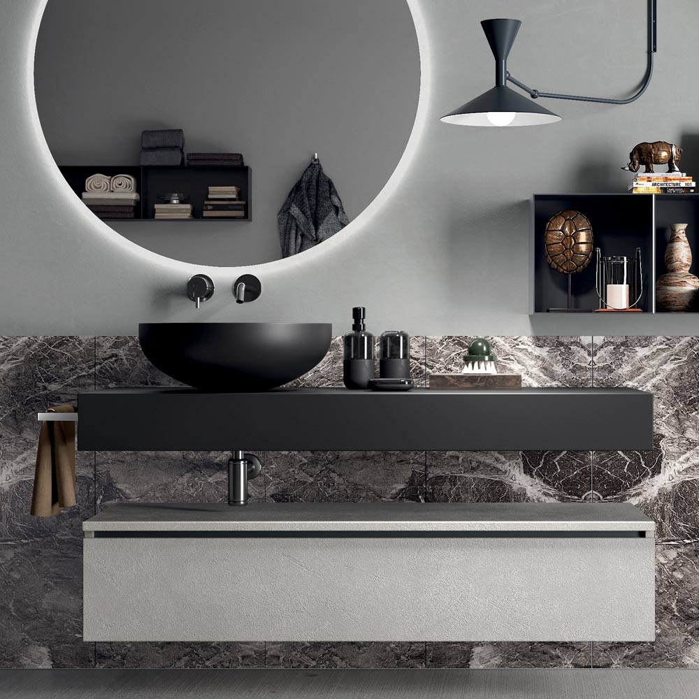 This composition with a modern style makes the bathroom unique and elegant thanks to the simple and at the same time refined finishes. Furthermore, the combination of materials is perfect to guarantee the quality and functionality that characterise bathroom furniture.