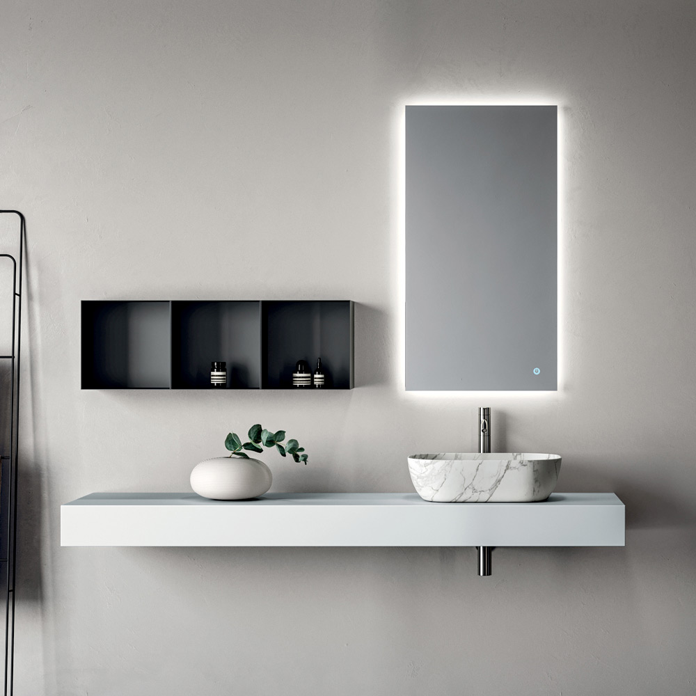 The backlit mirror completes the ensemble, offering functional and scenic lighting, perfect for enhancing the wall and visually enlarging the space.