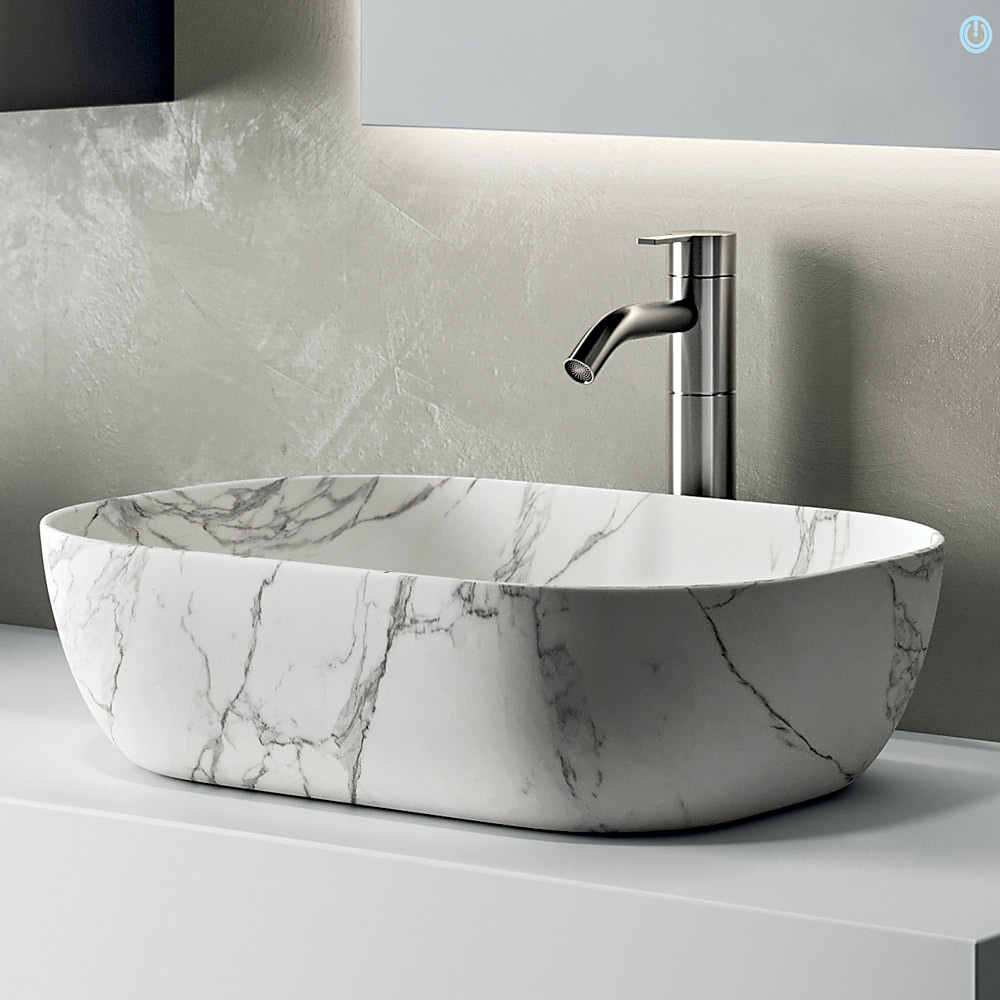 The Calacatta-finish ceramic sink adds a sophisticated touch: the marble-inspired surface enhances the brightness of the white and lends prestige to the sink area.