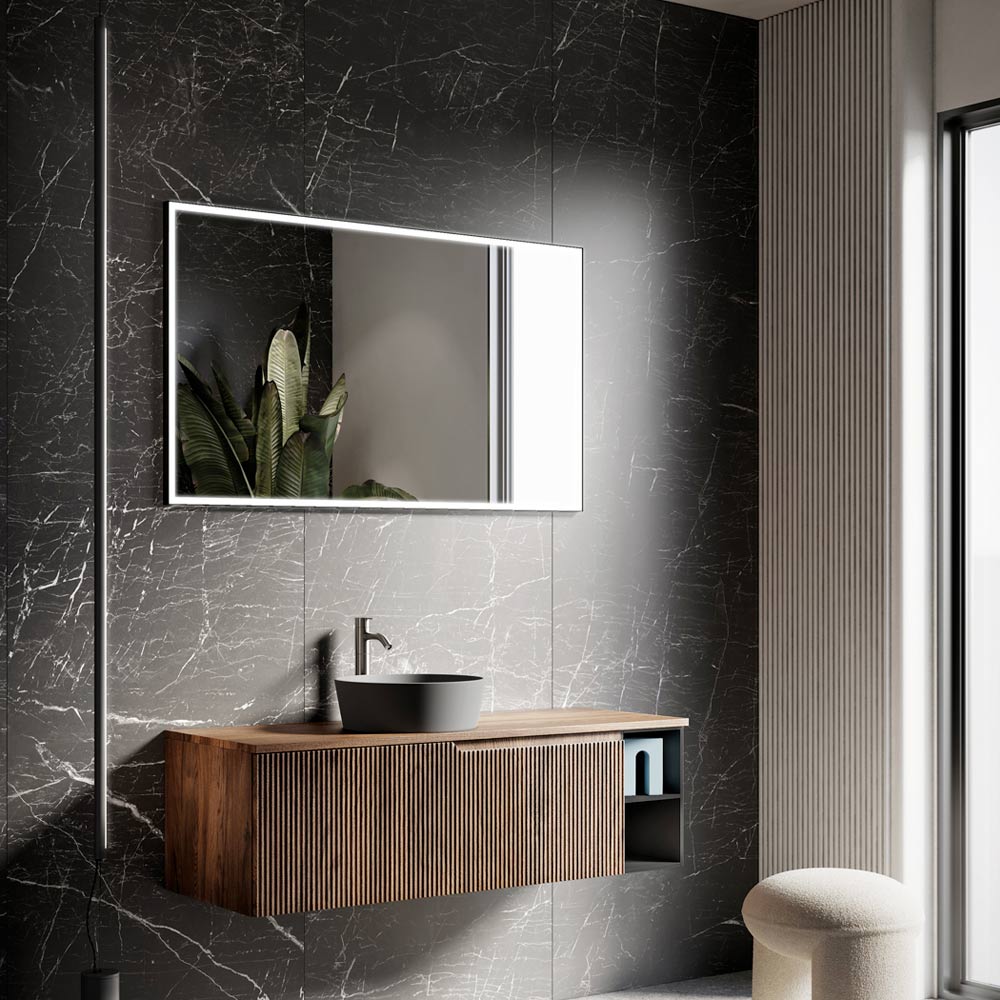 Bathroom composition entirely made in Italy consisting of a base with 1 drawer in MDF with ribbed Rio oak finish, an open element in smooth anthracite MDF, a matt black ceramic washbasin , a mirror with front LED light and black frame.