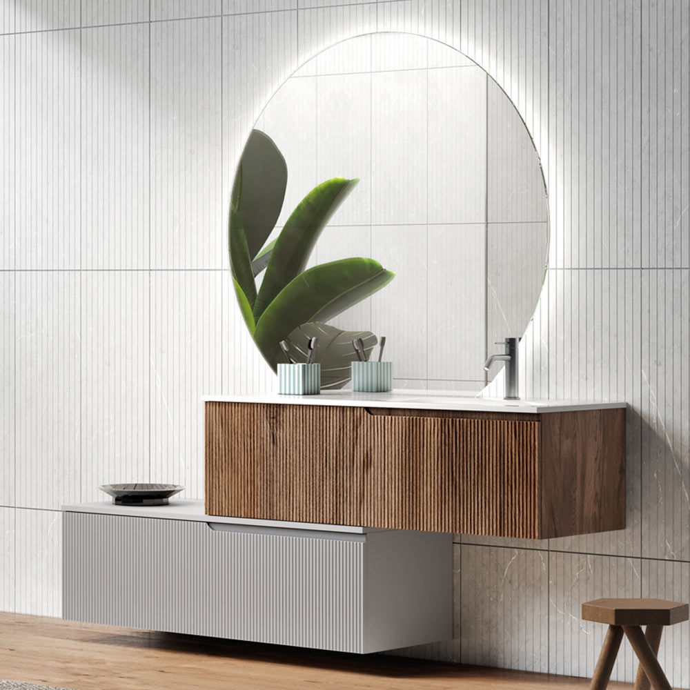 Bathroom composition in grey MDF and ribbed Rio oak Made in Italy