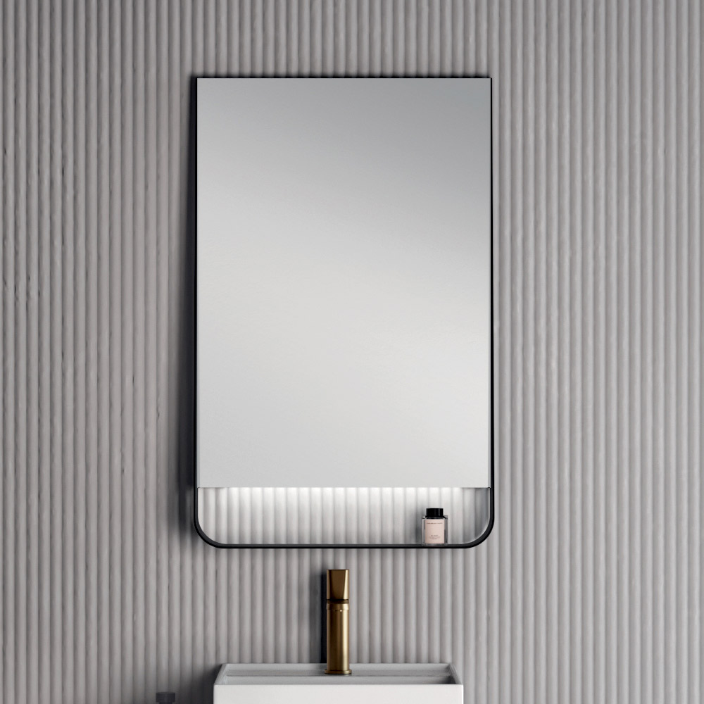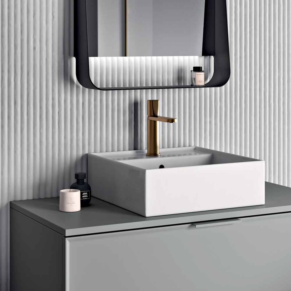 The Wing LED bathroom mirror with matt black frame completes the ensemble, an element with a strong personality that ensures functional and at the same time decorative lighting, enhancing the entire sink area.