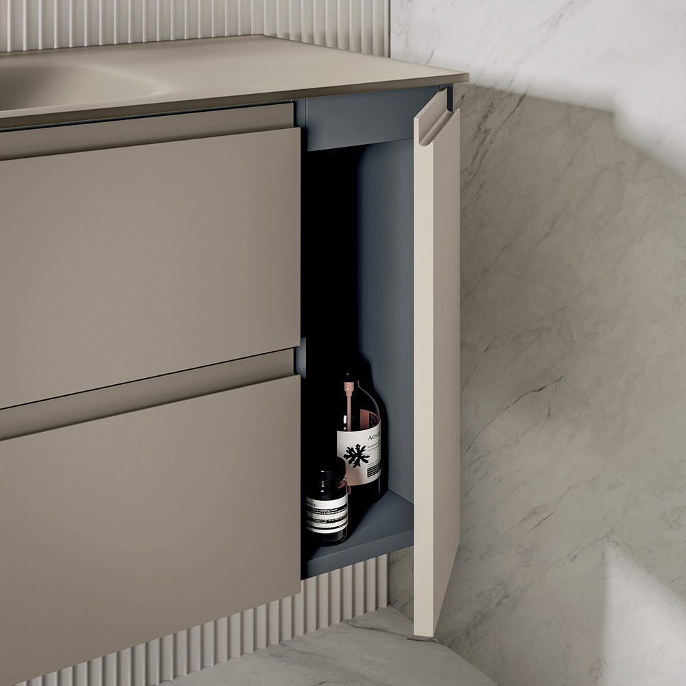 Completing the ensemble, the LED mirror ensures uniform and functional lighting, ideal for daily routines, while enhancing the matt finishes of the furniture.