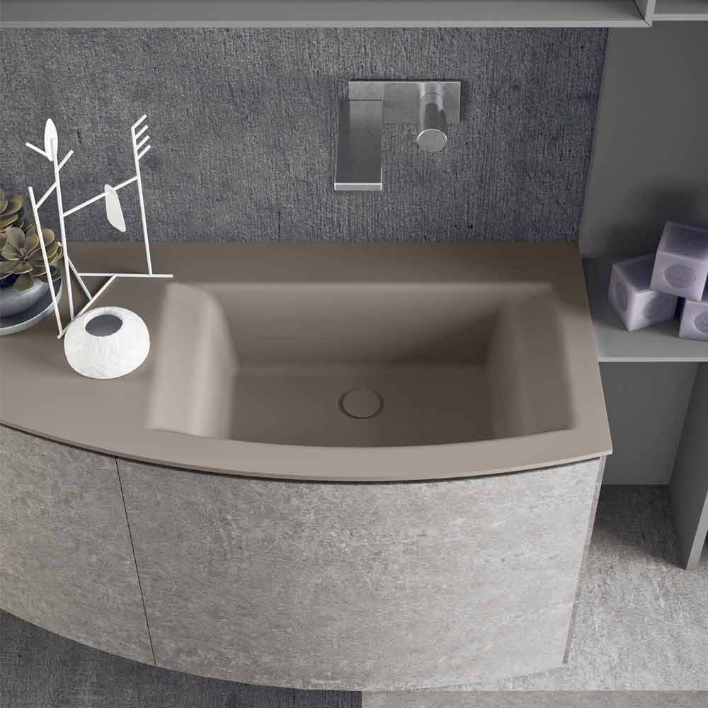 Bathroom furniture set with curved fronts in unicolor portland HPL , suspended column in unicolor portland HPL H 162 cm, integrated washbasin in matt dove grey Teknorit , open element in matt mouse lacquer, thick bench H 10 cm.