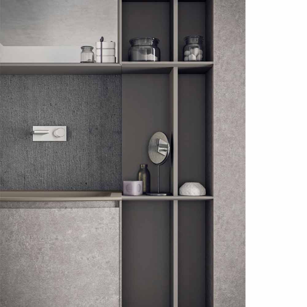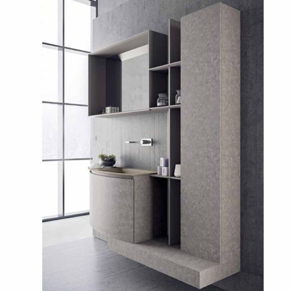 Volumetric and modern bathroom composition, suspended design with integrated washbasin, made in Italy.