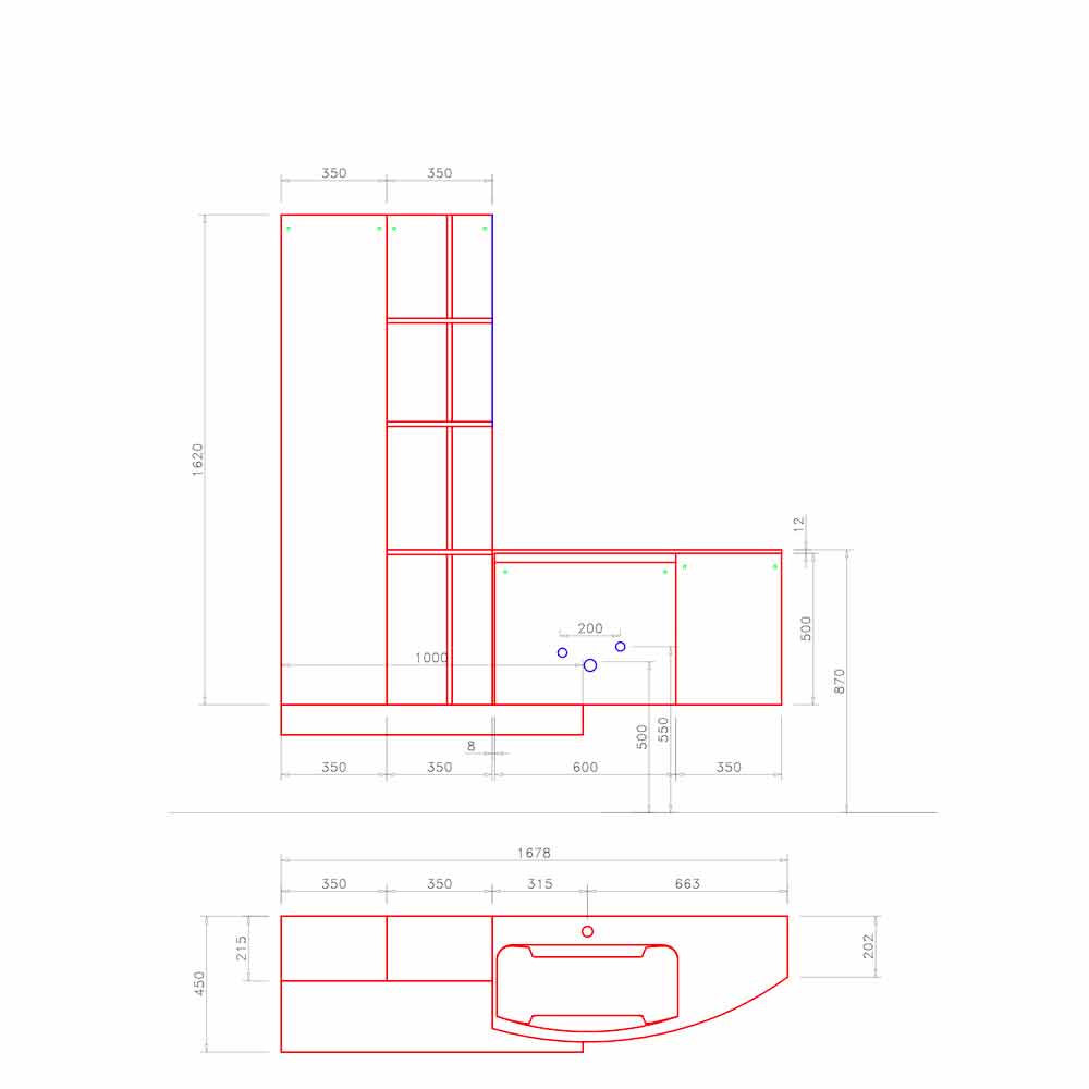 This formal clarity is given by the groove door with an inclined profile. The peculiarity of this composition is given by the built-in washbasin characterized by two lateral sides that gently descend towardss the basin and by the curved wall unit that contains it.