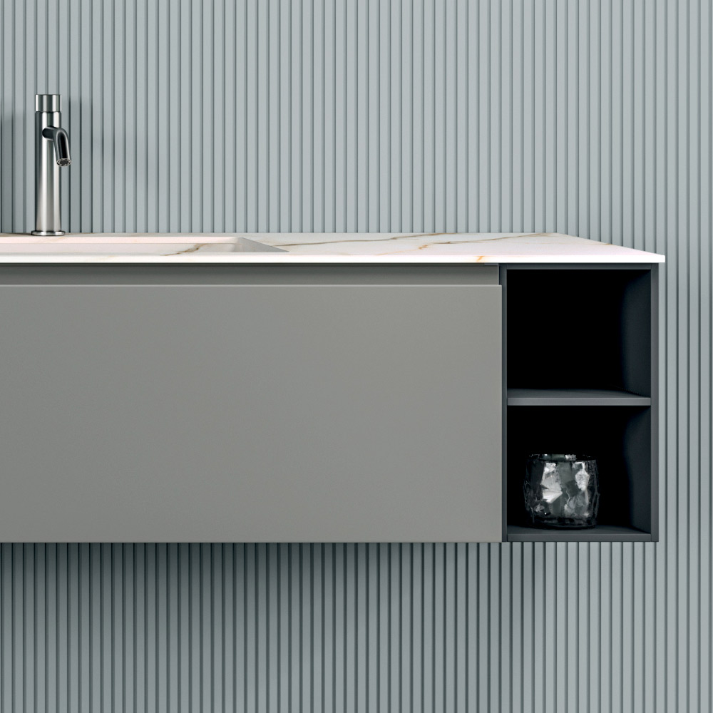 The suspended base with large basket , proposed in a matt grey finish, guarantees a spacious storage solution while maintaining an essential and tidy aesthetic.