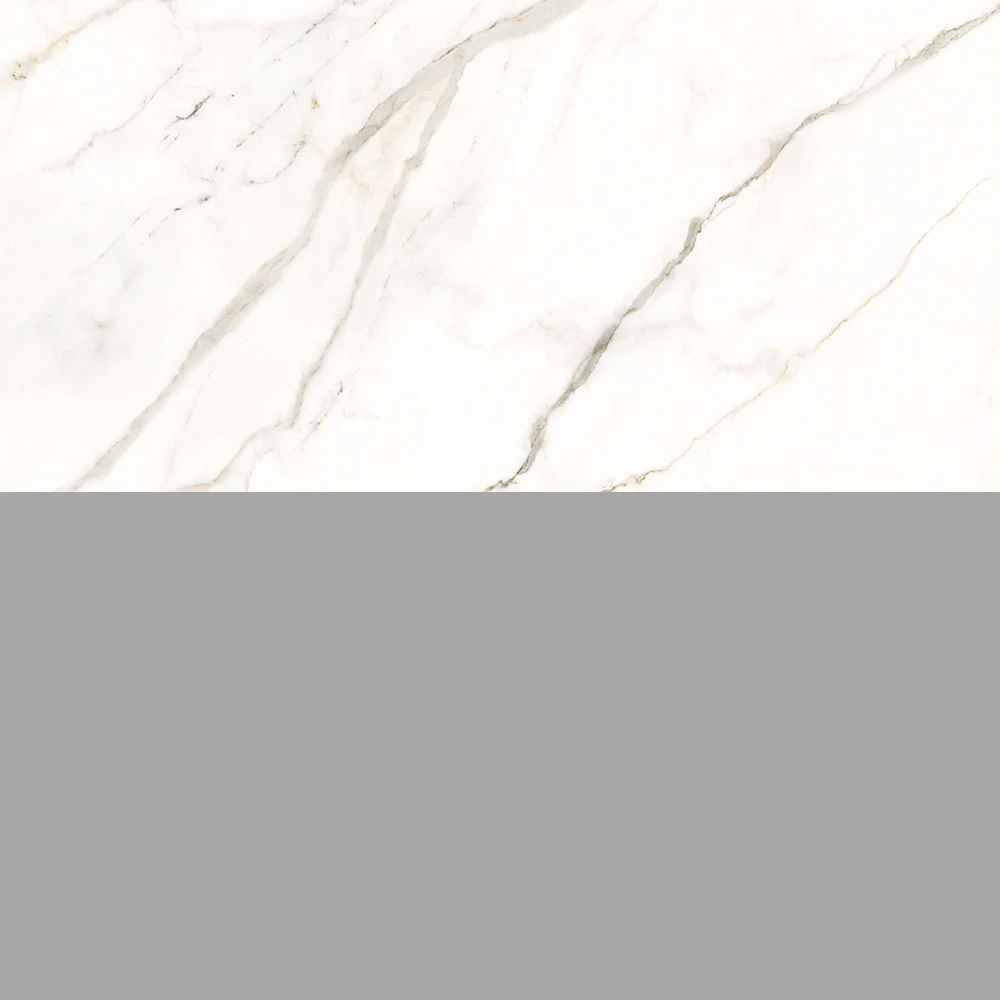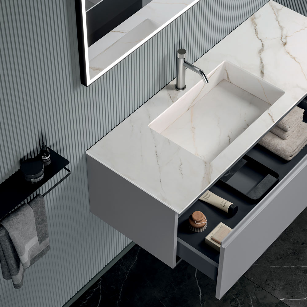 The Calacatta Gold stoneware integrated sink countertop is the aesthetic heart of the composition. The elegant, luminous veining recalls the nobility of marble, while also offering durability, practicality, and ease of maintenance.