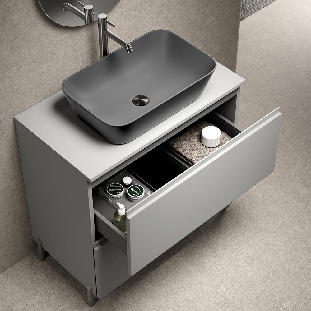 A solution designed for those who want a modern bathroom cabinet with legs , characterised by trendy matt finishes and anthracite details with a strong aesthetic impact.