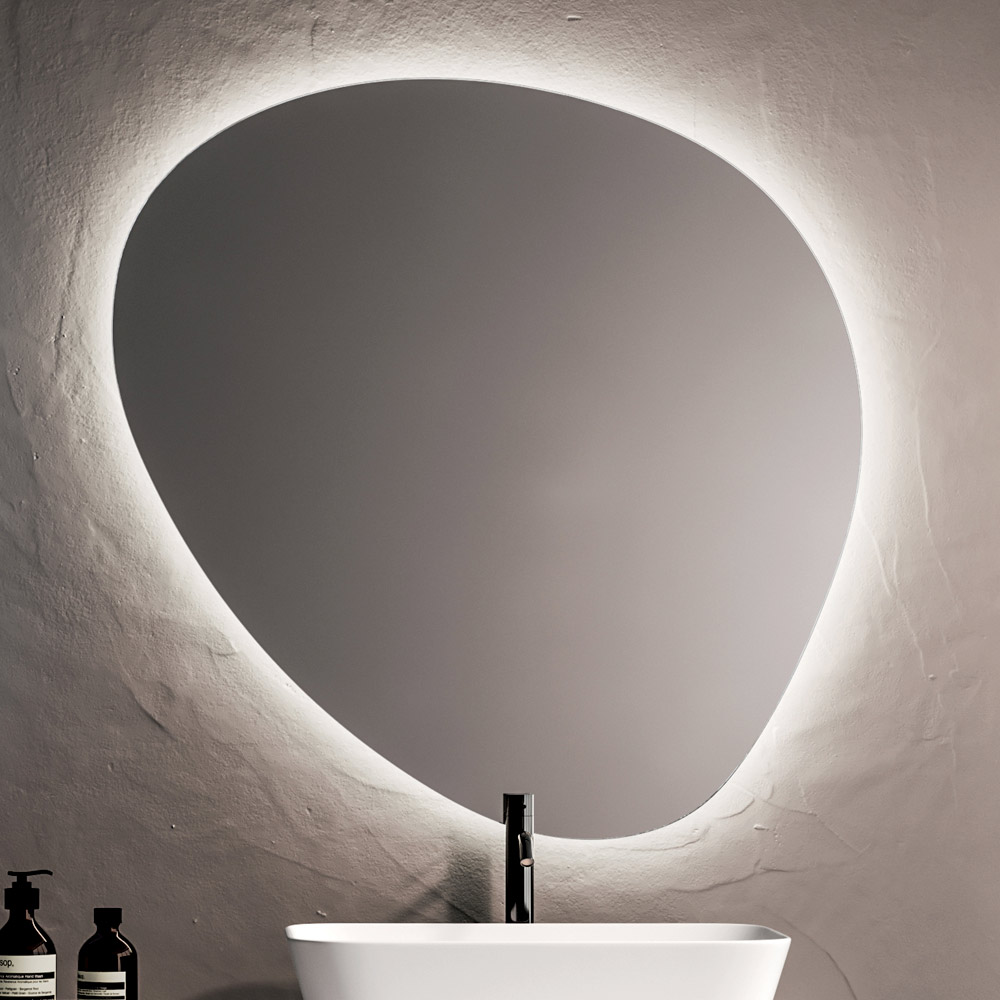 The composition's focal point is the contoured LED mirror , which casts a soft, enveloping light along the perimeter, enhancing the bathroom space and creating an elegant, relaxing atmosphere. The integrated lighting improves visual comfort and accentuates the contemporary feel of the space.