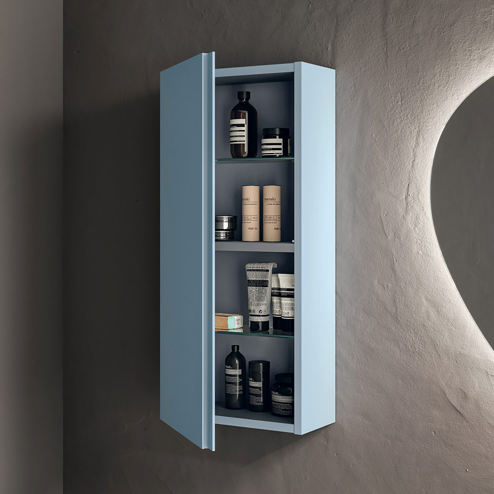 The coordinated Tiffany-colored wall unit completes the ensemble, ideal for expanding the storage capacity without weighing down the composition, maintaining a refined and minimal aesthetic coherence.
