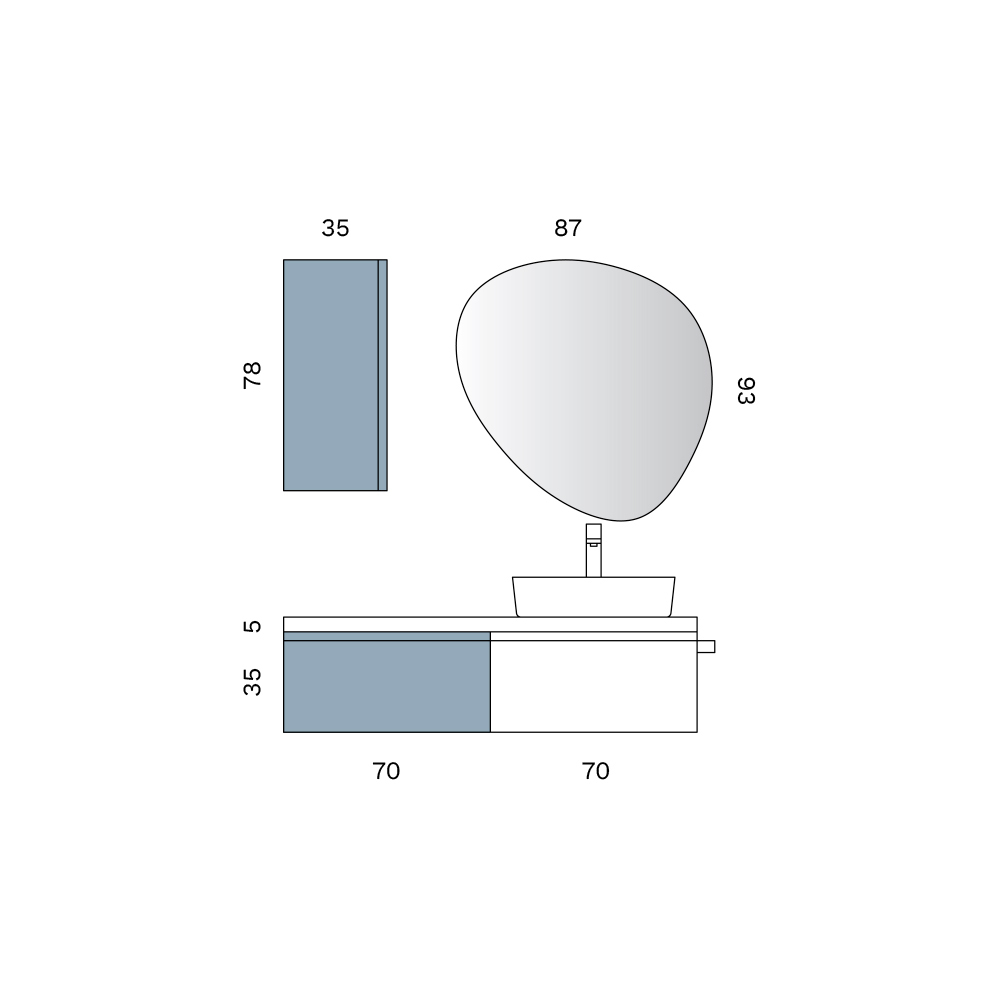 The wall-mounted base units with a large basket , in a white and Tiffany finish, offer a practical and discreet storage solution, enhanced by a delicate and contemporary matte finish. The clean lines help create an uncluttered, visually light and harmonious space. A black towel rail is also included.