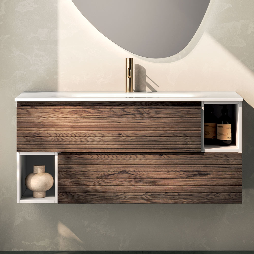 A designer bathroom furniture proposal ideal for those seeking a balance between contemporary aesthetics, natural materials, and advanced functionality, transforming the bathroom into an elegant, welcoming space with a strong personality.