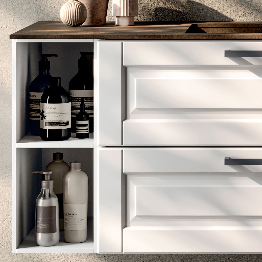 The wall-mounted base unit with double drawer and open compartments stands out for its clean lines and essential design, conceived to offer visual balance and everyday functionality. The integrated stoneware sink enhances the surface with a deep, textured effect, inspired by the natural hues of oxidized metals.
