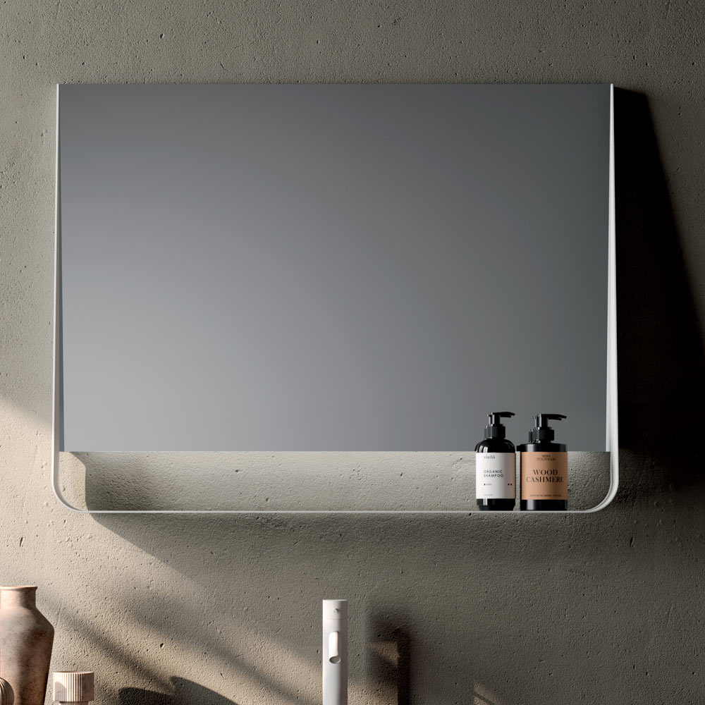 The shaped mirror completes the composition with a bold graphic design, amplifying the brightness of the room and helping to create a modern and refined atmosphere.