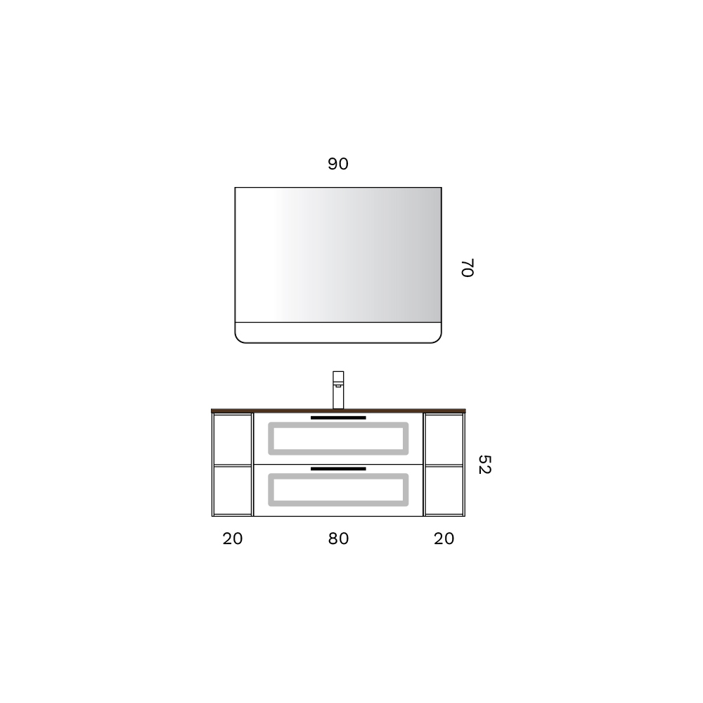 • Mirror: length 90 cm x depth 12 cm x height 70 cm