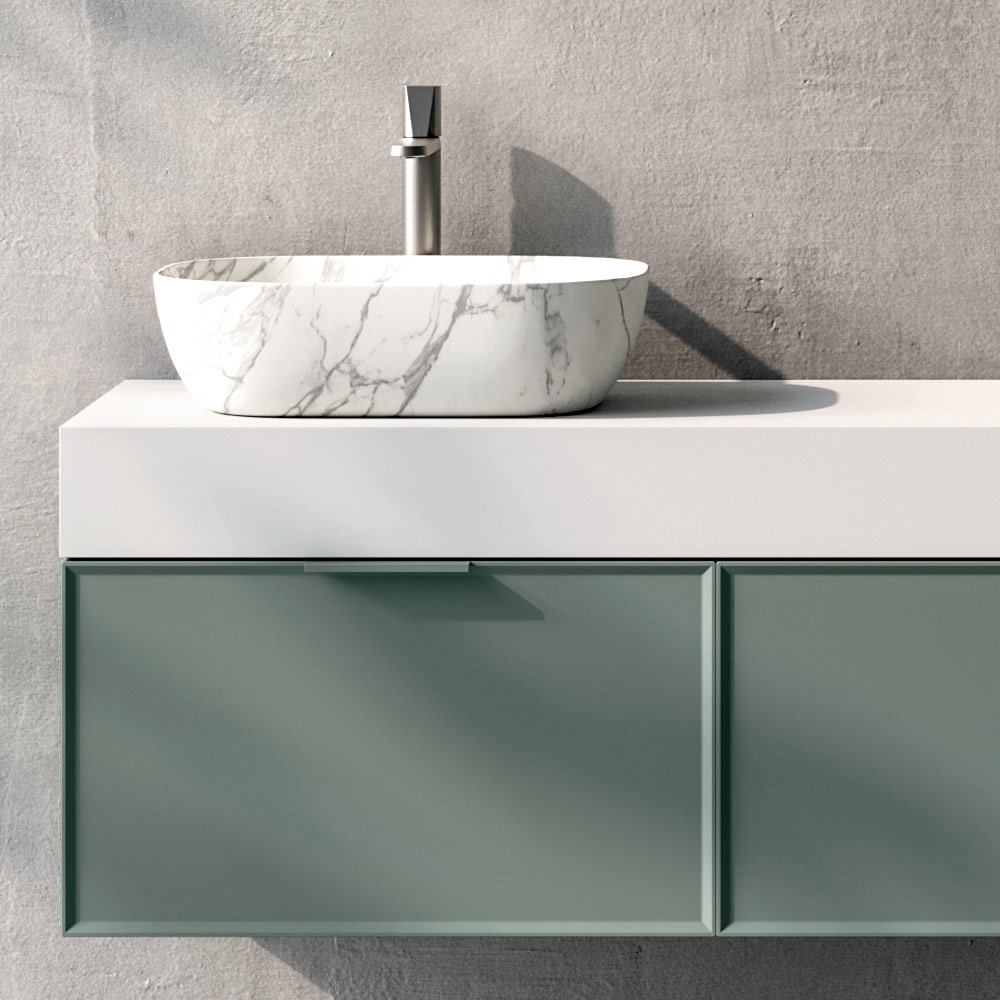 The matt white washbasin top harmoniously accompanies the Calacatta-effect ceramic washbasin , characterised by a luminous surface and delicate veining reminiscent of marble, enhancing the entire composition.