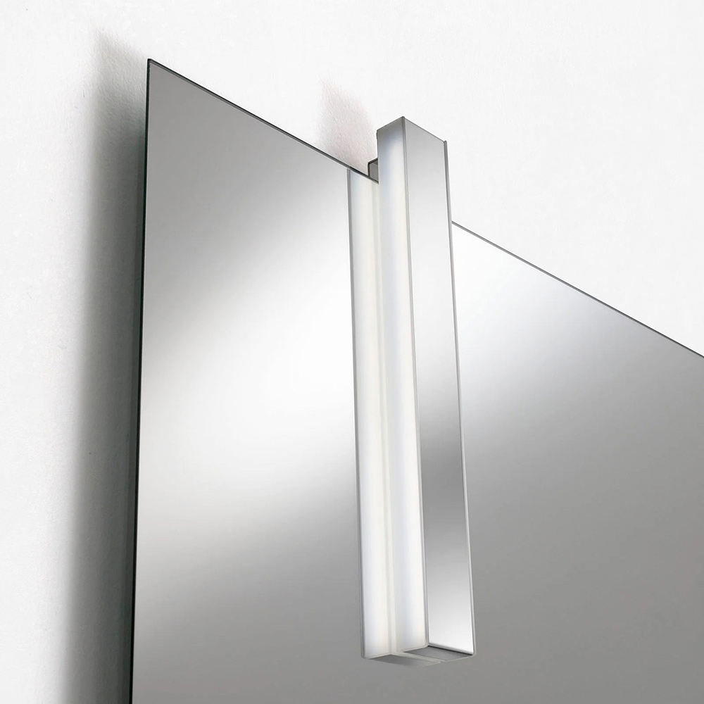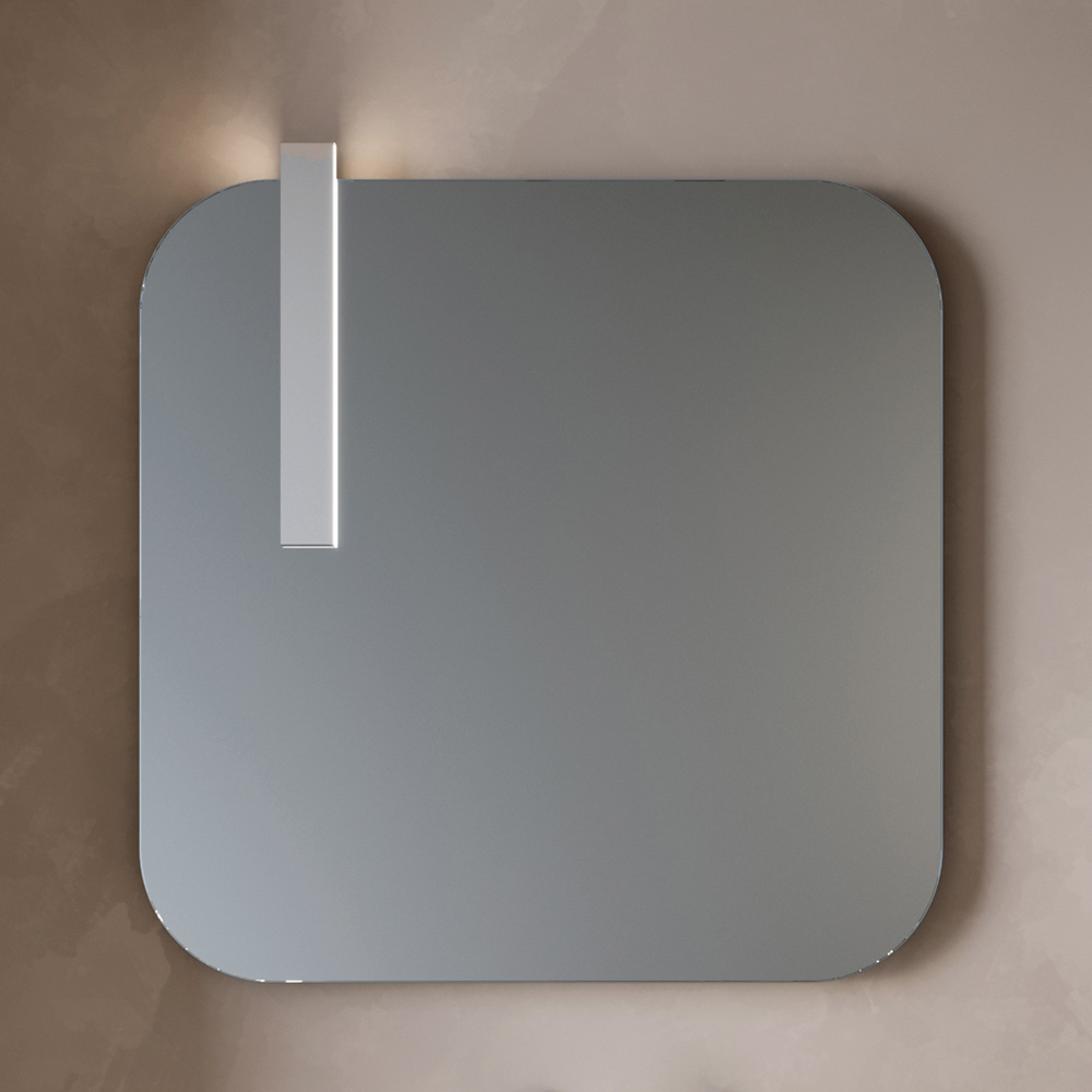 The shaped mirror adds character and personality to the composition, while the LED lamp with a chrome finish ensures elegant and functional lighting, ideal for the sink area.