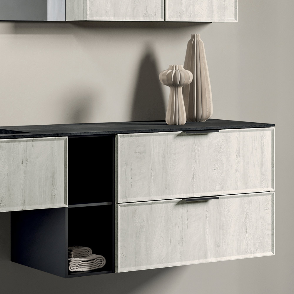 The composition integrates a large and capacious base with drawers (the first drawer is closed), designed to ensure order and everyday practicality, flanked by 2 wall units that expand the storage space while maintaining a light and balanced aesthetic.