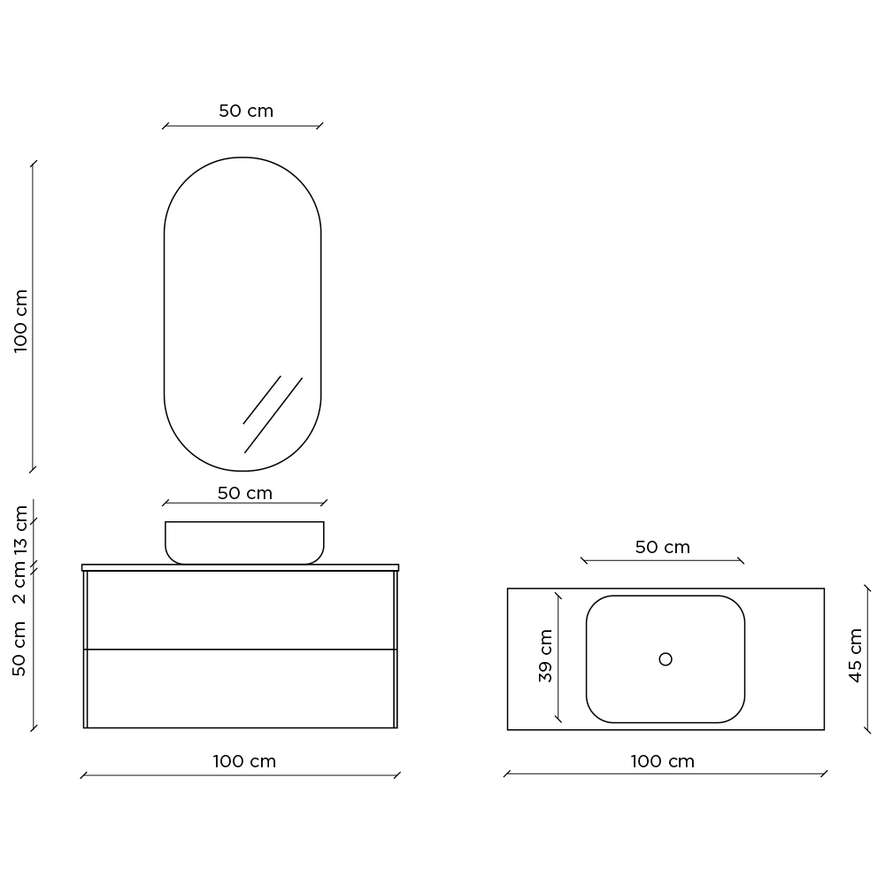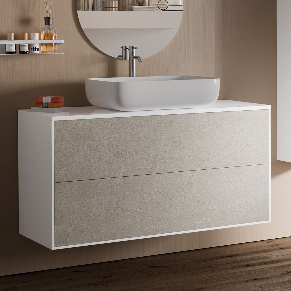 Bathroom composition with base Ā in scratch-resistant melamine with 2 fully extractable drawers and soft close closure in Havana stone colour , oval mirror and console sink in glossy white ceramic .