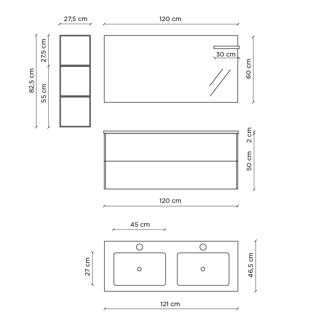 Base: L 121cm x D 46.5cm x H 52cm