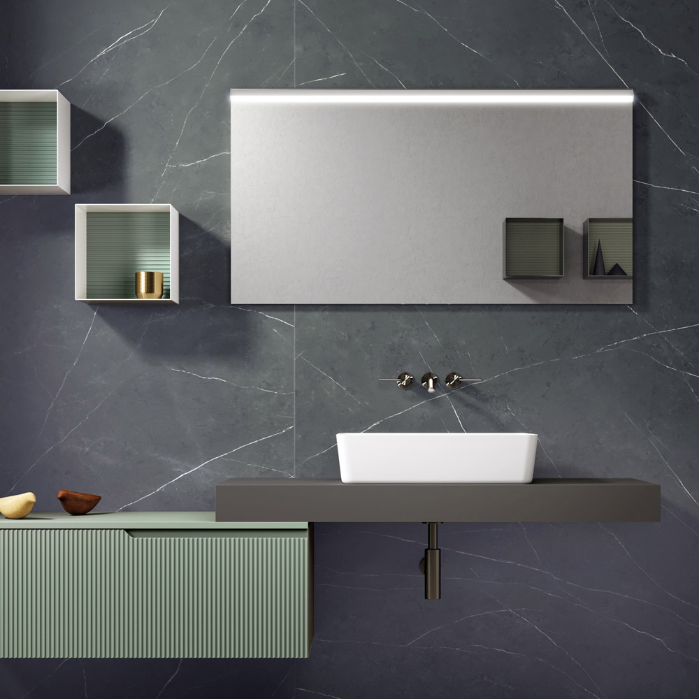 Bathroom composition entirely made in Italy consisting of a base with 1 drawer in MDF with ribbed sage green finish, anthracite boxed sink top , a white ceramic washbasin , mirror with single front LED light, 2 white metal wall units and ribbed sage green background.